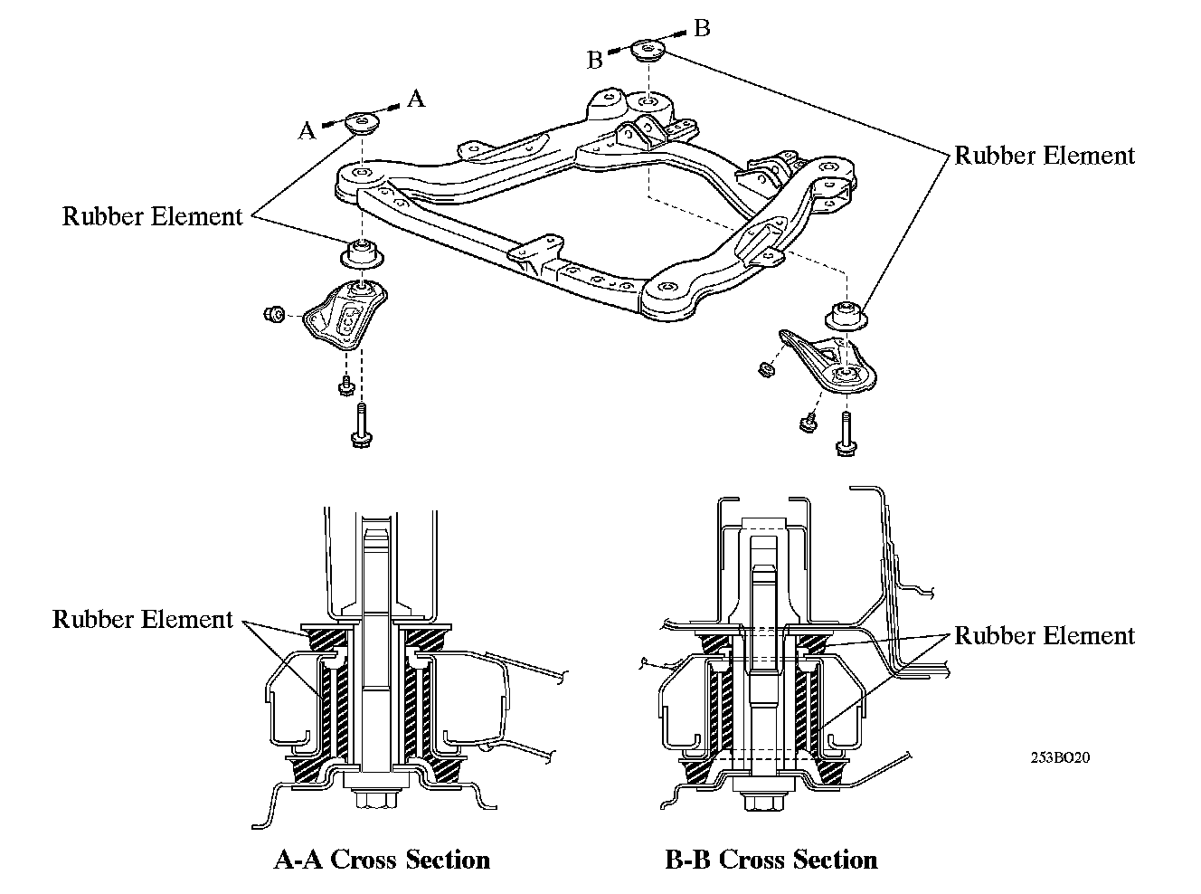 The engine and the transaxle are mounted on the front suspension, and the lower arms and the steering rack are mounted via the front suspension member. These double vibration isolation measures on the body have been taken to reduce engine and road noise.