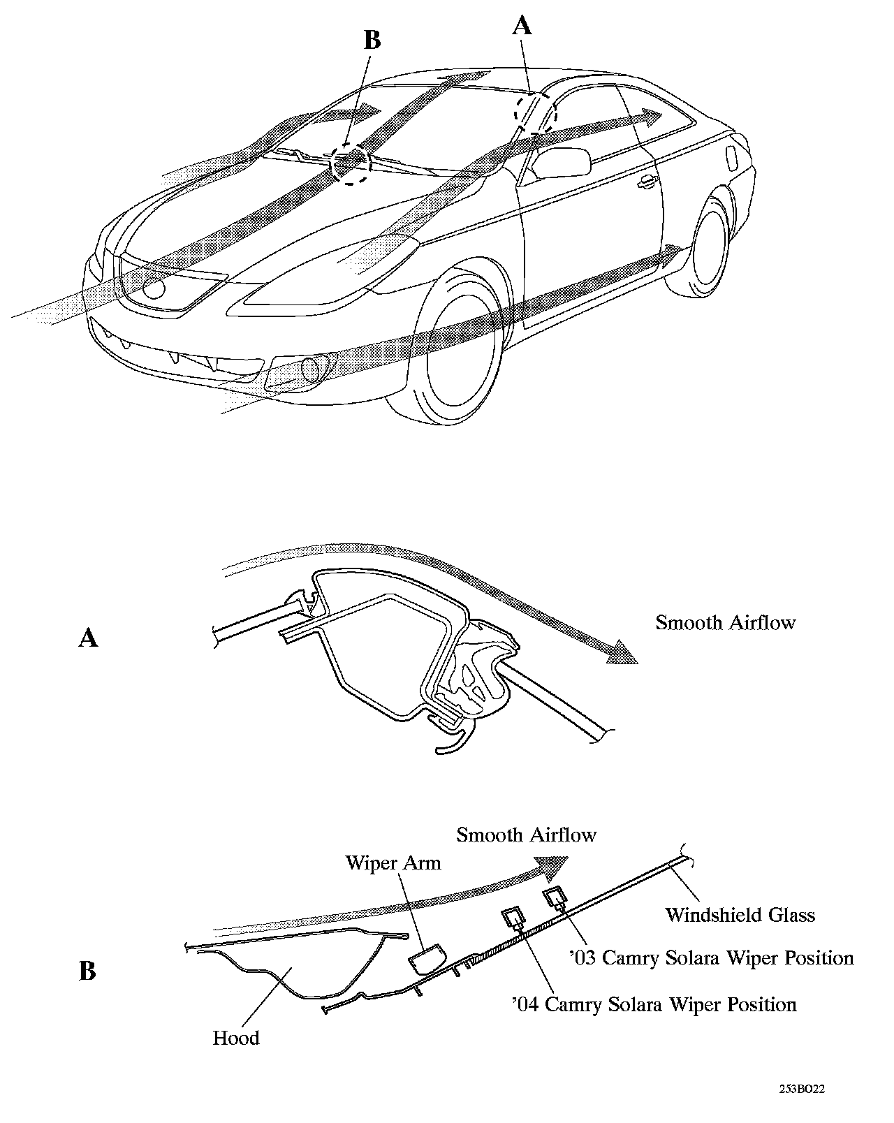 The features listed below have been adopted on the '04 Camry Solara in order to ensure a high level of body rigidity against torsion, thus reducing noise and vibration.