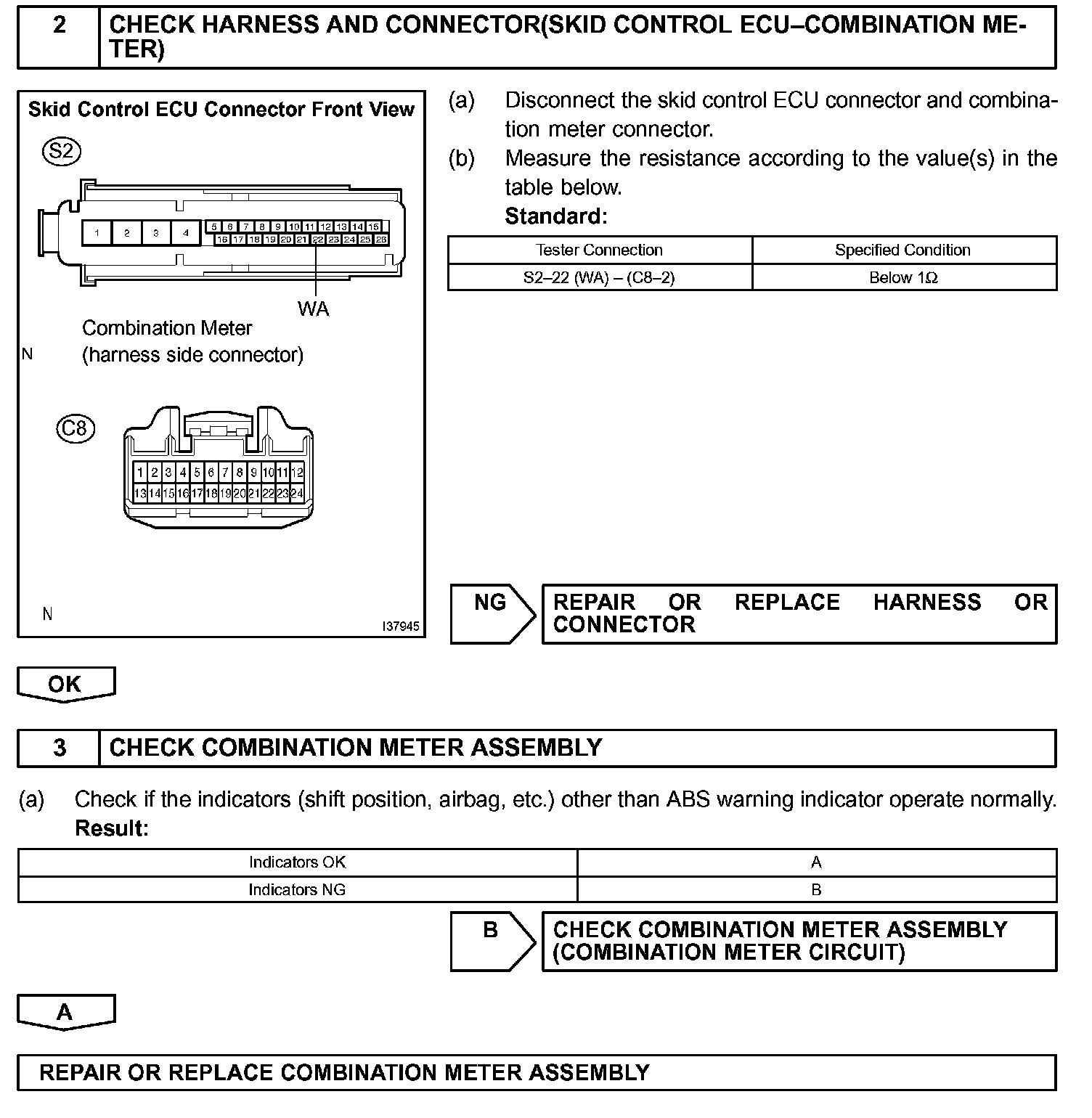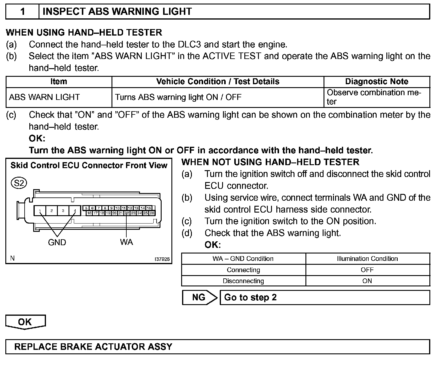 If the ECU detects trouble, it will prohibit ABS control, turn on the ABS warning light, and store the DTC. Connect terminals TC and CG of the DLC3 to make the ABS warning light blink and output the DTC.