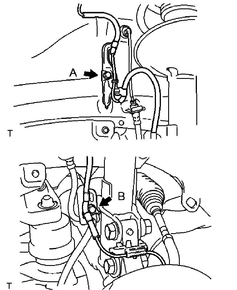 b. Install the sensor harness clamps with the 2 bolts "A" and "B" to the body and shock absorber.