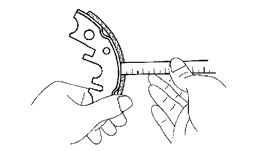 If the lining thickness is less than or equal to the minimum, or if there is severe or uneven wear, replace the brake shoe.