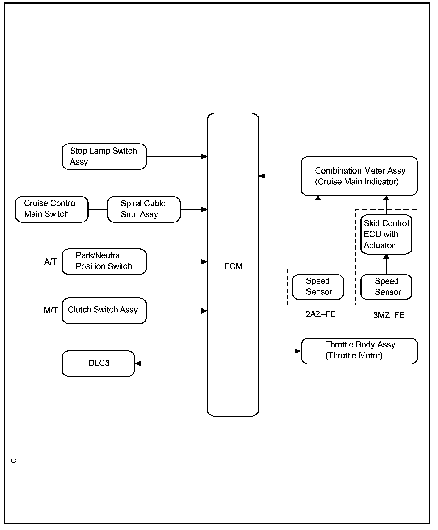 a. Cruise control system makes it possible to drive at a desired speed without using the accelerator pedal. ECM controls the throttle opening angle based on signals from switches and sensors.