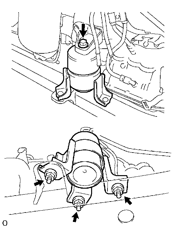 a) Remove the 3 nuts and bolt. Then separate the engine mounting insulator.