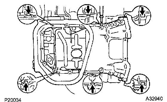 c) Using a screwdriver, remove the oil pan by prying the portions between the cylinder block and oil pan shown in the illustration.