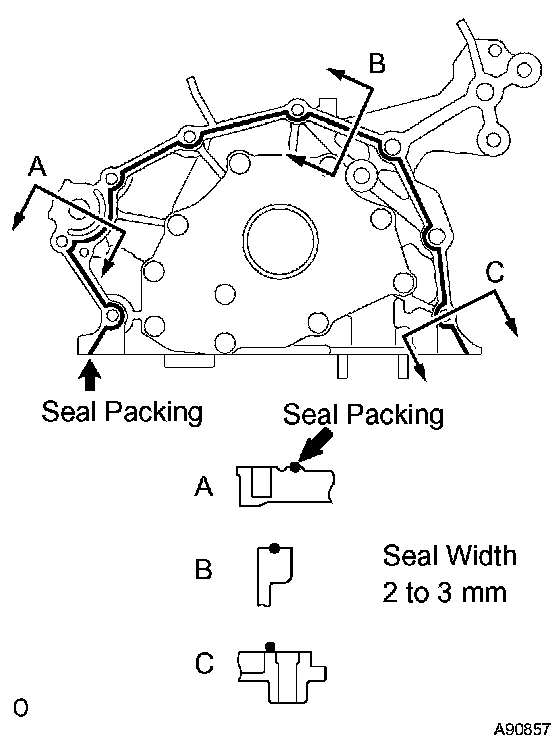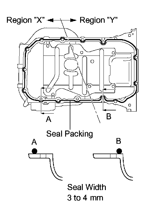 b) Apply a continuous bead of seal packing (diameter: 3 to 4 mm (0.12 to 0.16 inch)) as shown in the illustration.