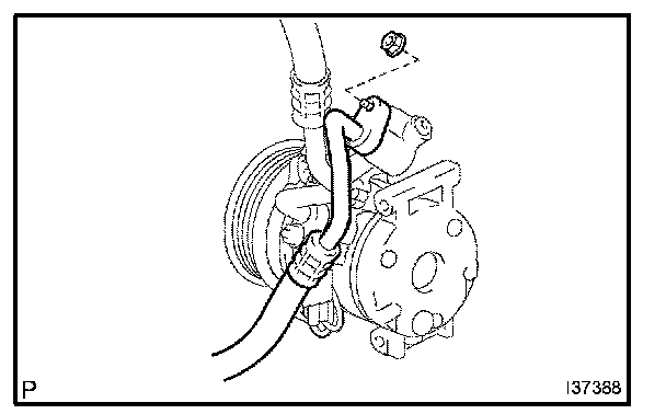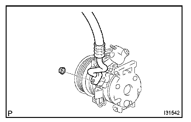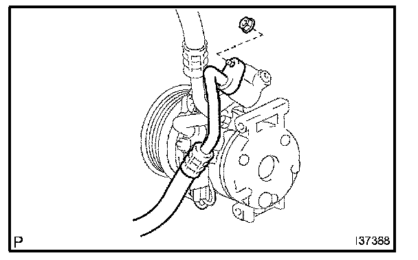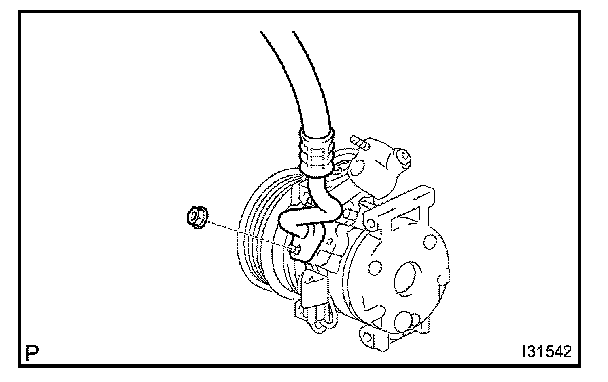d. Install the cooler refrigerant suction hose No.1 to the compressor and magnetic clutch with the nut.