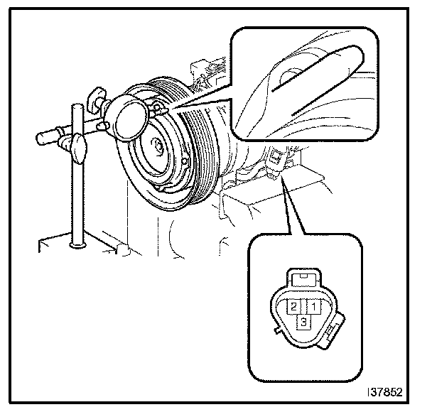 b. Connect the battery positive lead to terminal 3 of the magnet clutch connector and the negative lead to the earth wire. Turn the magnet clutch on and off and measure the clearance.