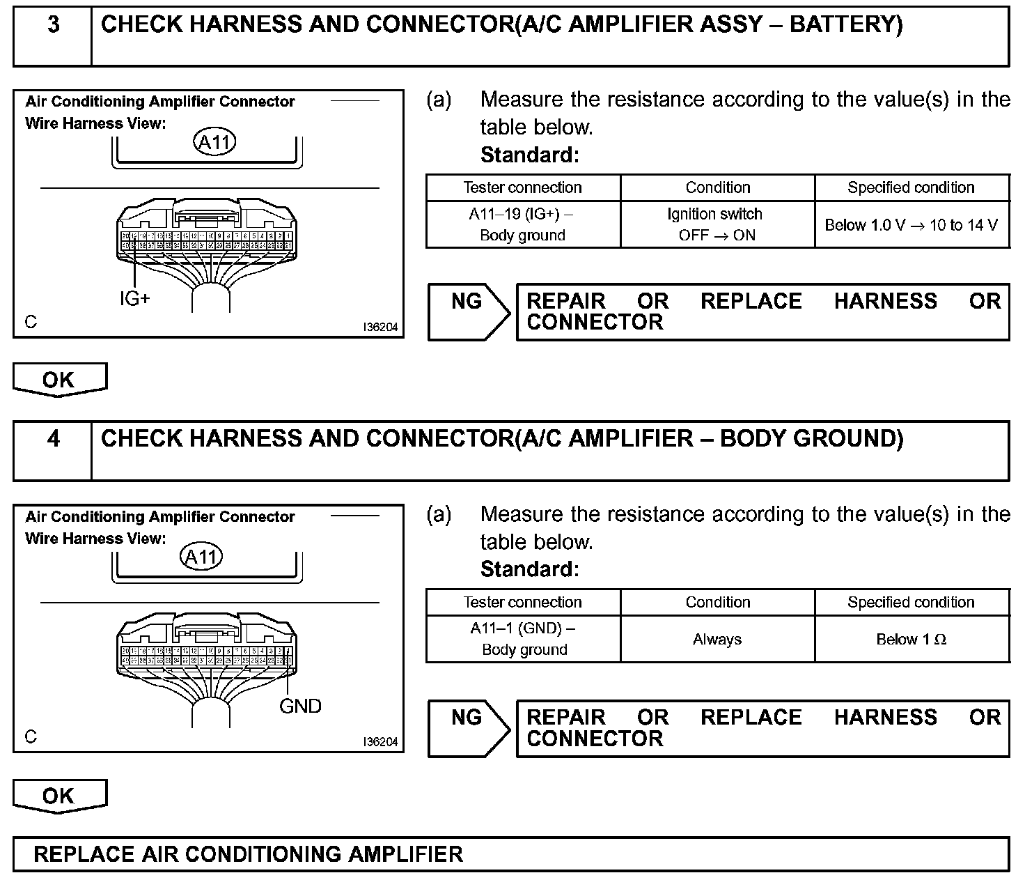 This is the main power source supplied to the A/C amplifier when the ignition switch is turned to the ON position. The power source supplied is used for operating the A/C amplifier and servomotor, etc.