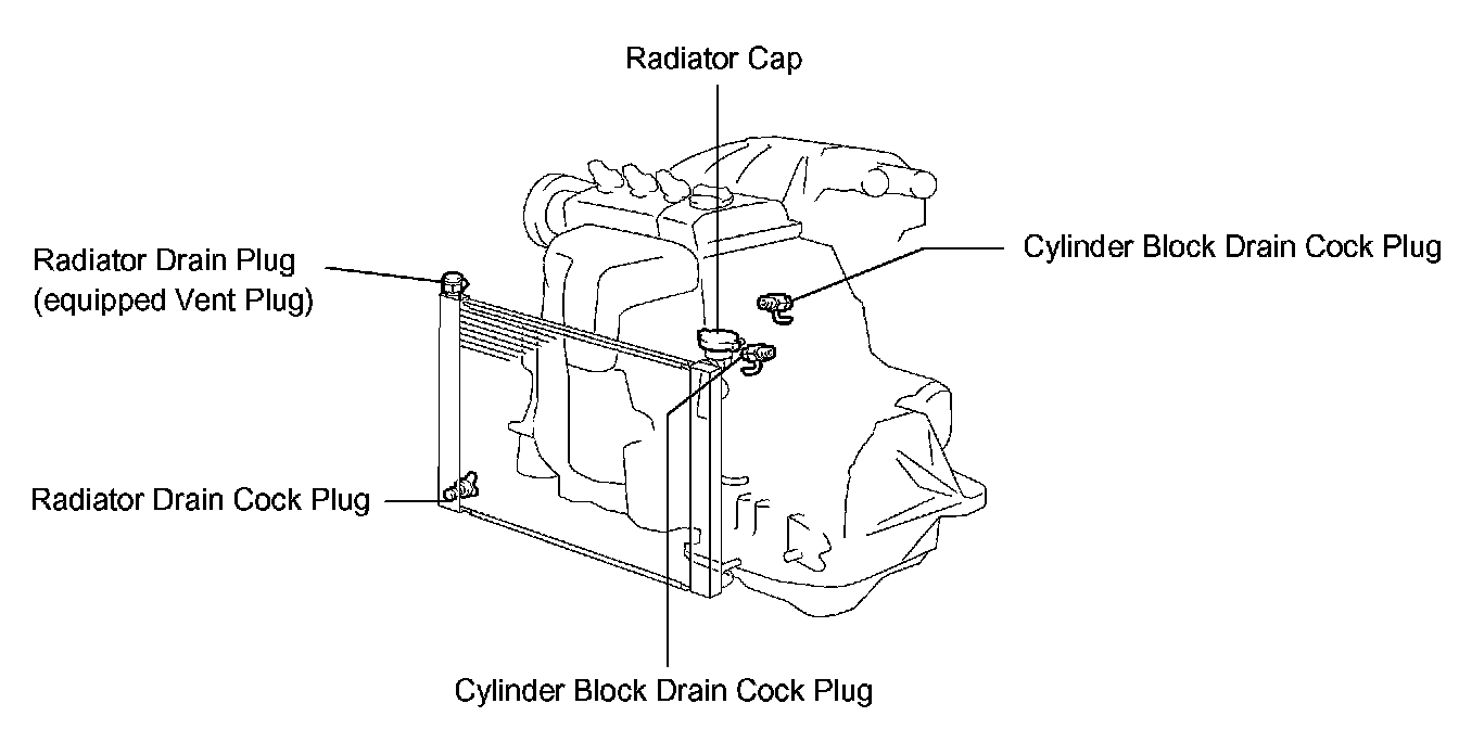 b) Drain engine coolant by loosening the radiator drain cock plug and the engine's cylinder block drain cock plug.