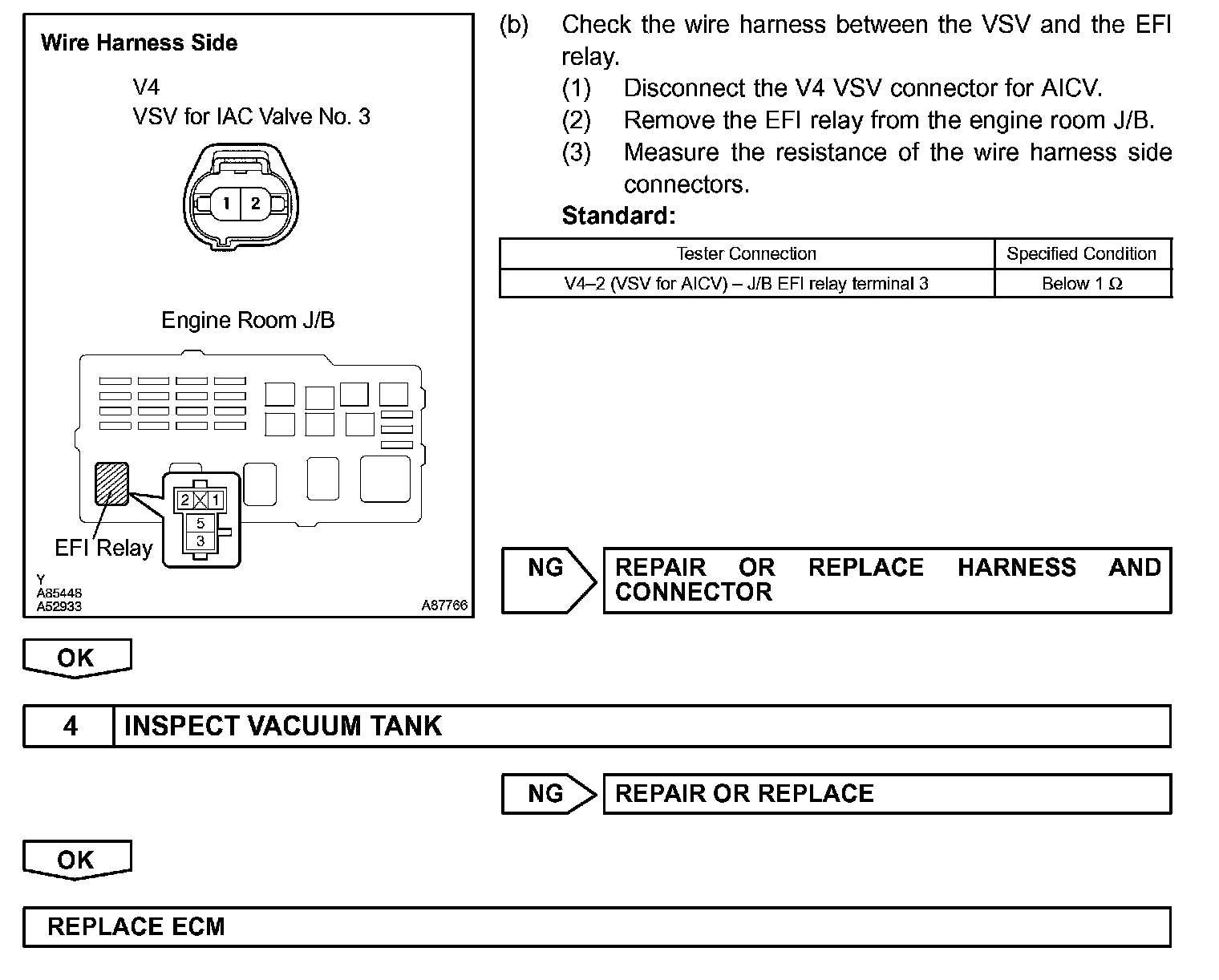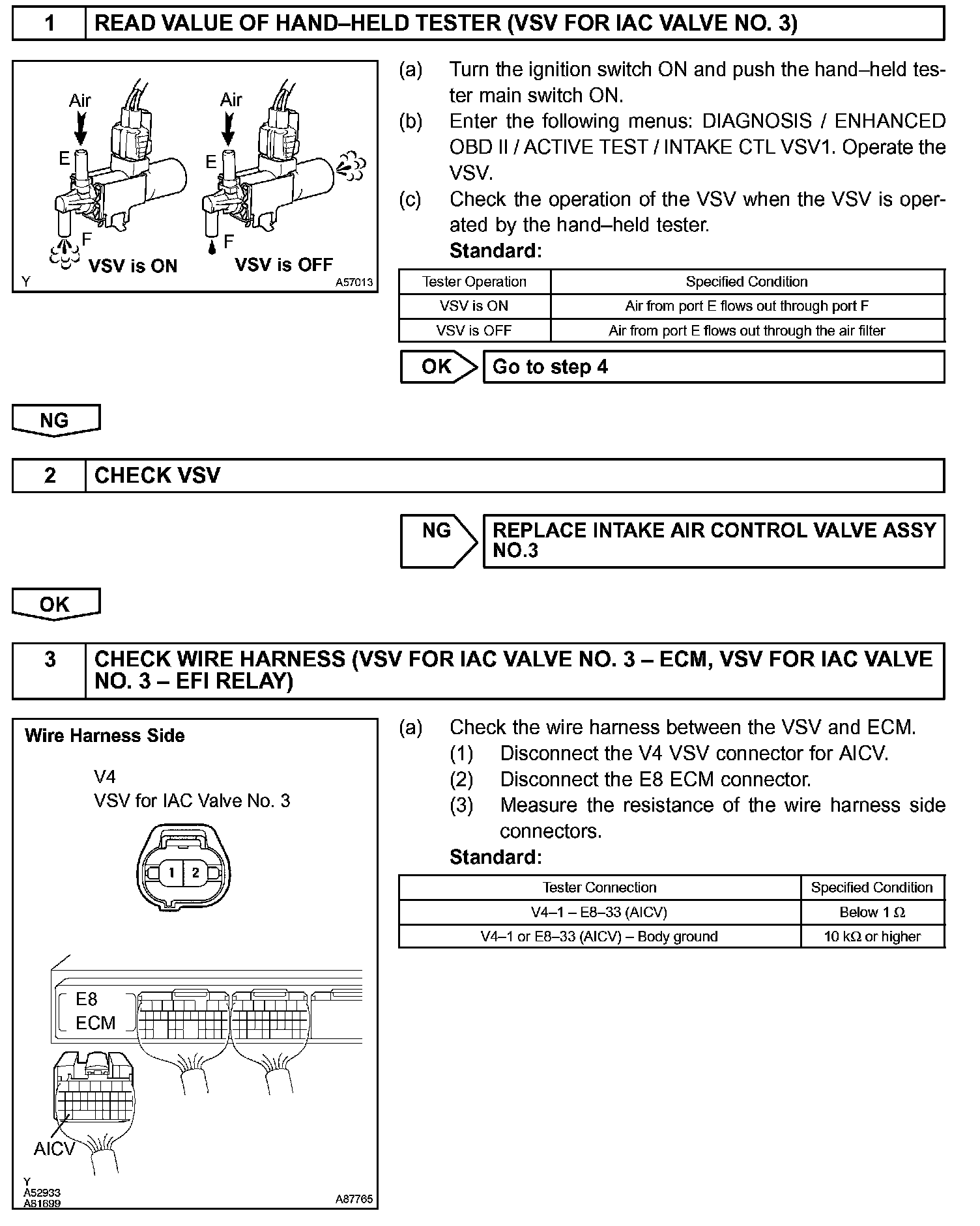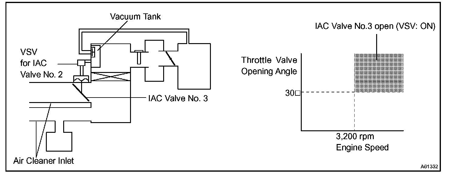 When the engine is operating at low to mid speeds, this system operates the IAC valve to close one of the air cleaner inlets. When the engine speed is more than 3,200 rpm and the opening angle of the throttle valve is more than 30°, the ECM activates the VSV and opens the IAC valve No. 3.