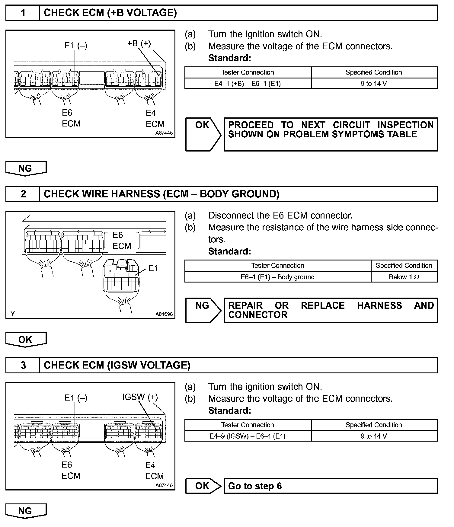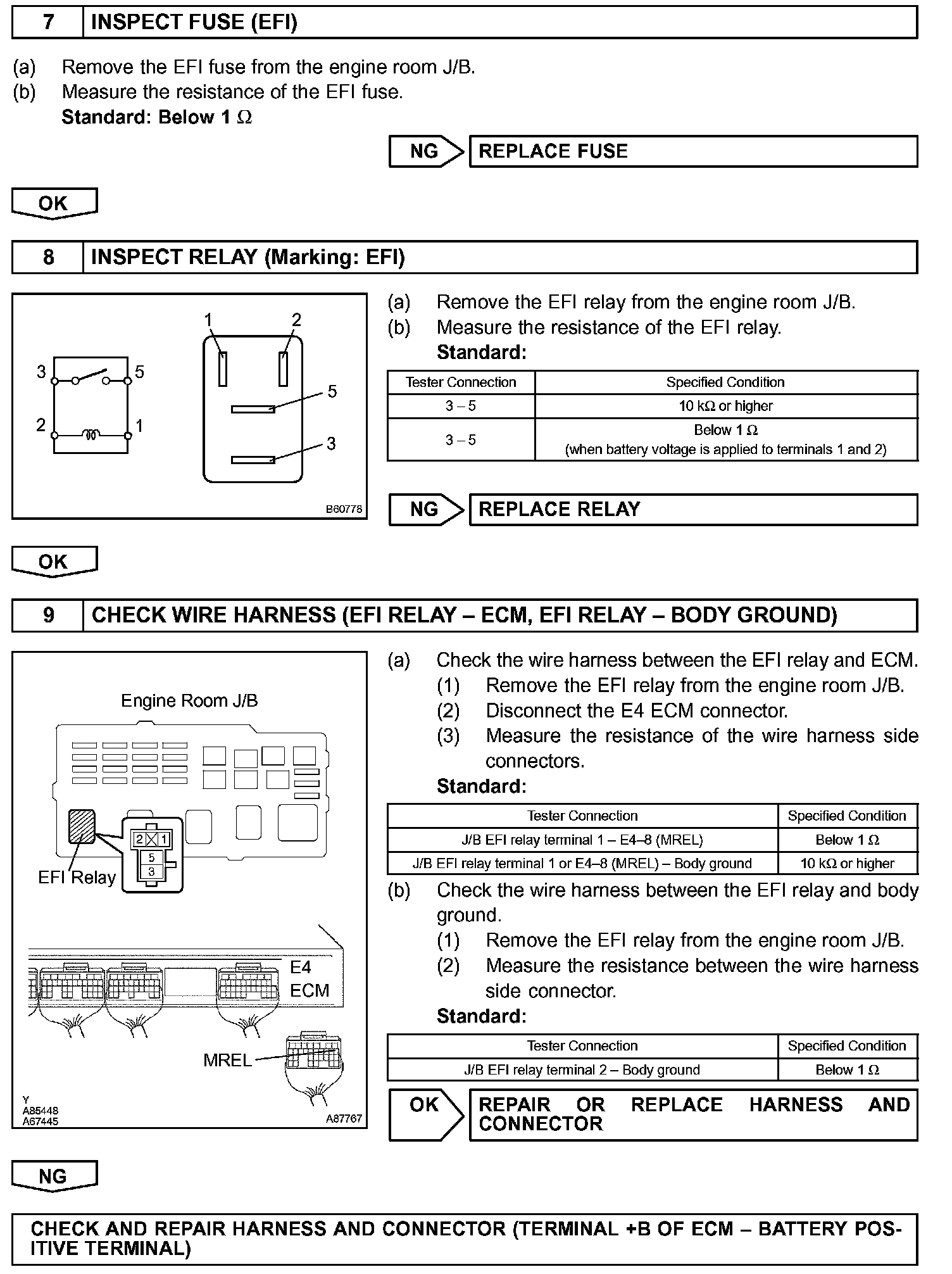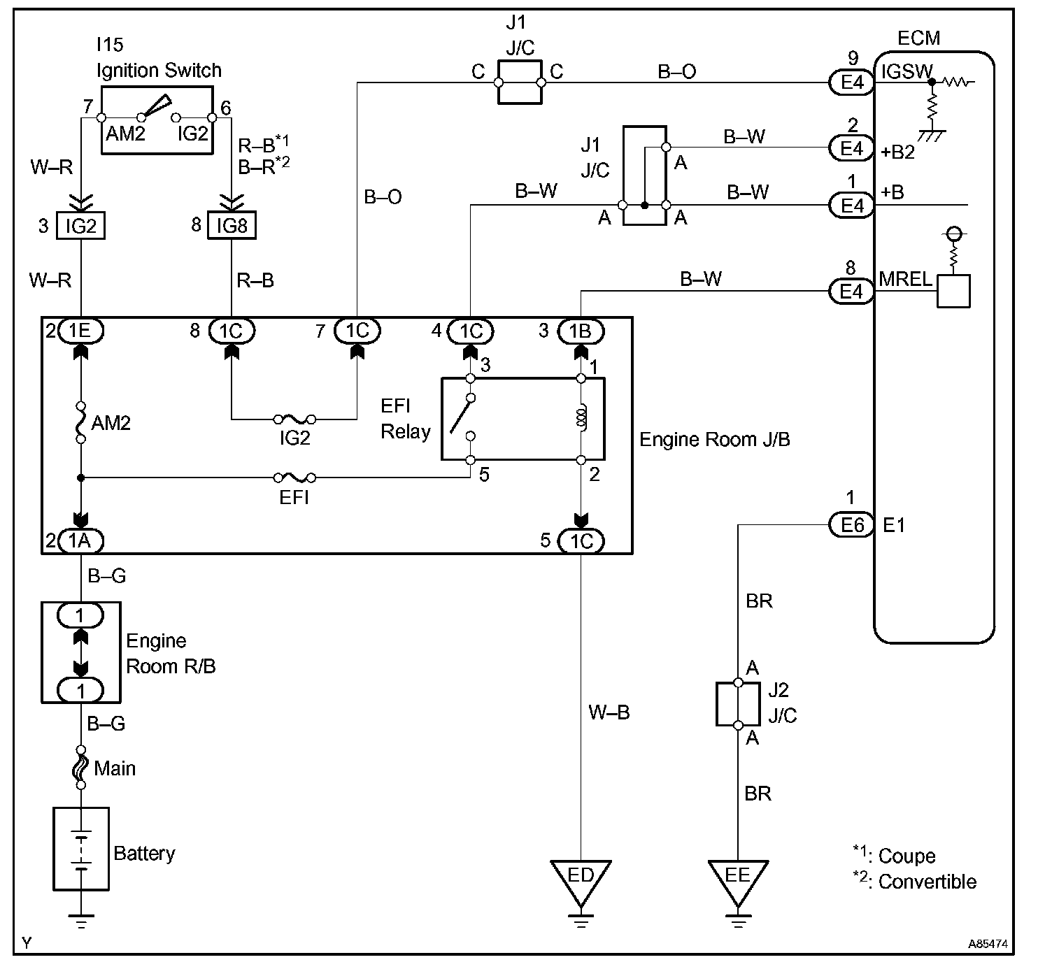 When the ignition switch is turned ON, battery voltage is applied to terminal IGSW of the ECM. The ECM "MREL" output signal causes current to flow to the coil, closing the contacts of the EFI relay (marked: EFI) and supplying power to terminal +B of the ECM.