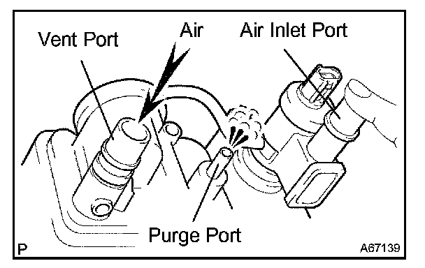 2. While holding the air inlet port closed, blow air (0.39 kPa (4.0 gf/sq.cm, 0.06 psi)) into the vent port, and check that air flows from the purge port.