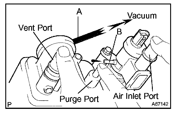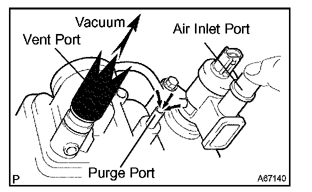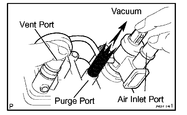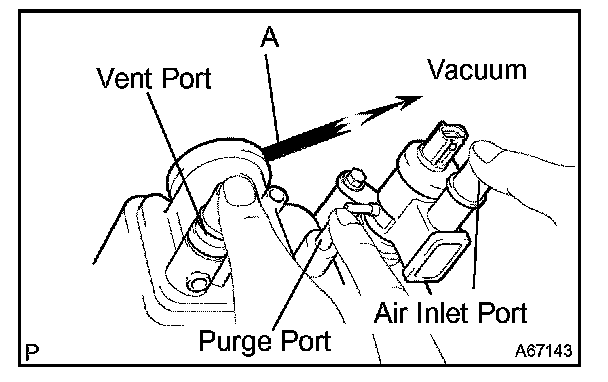 1. While holding the vent and air inlet ports closed, apply vacuum (3.43 kPa (25.7 gf/sq.cm, 1.01 psi)) to the purge port, and check that the vacuum is maintained for 1 minute.