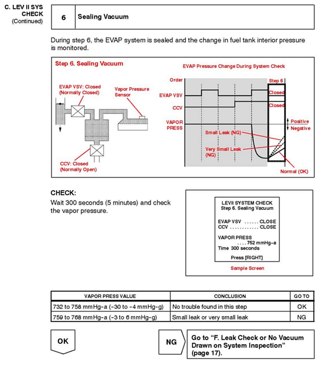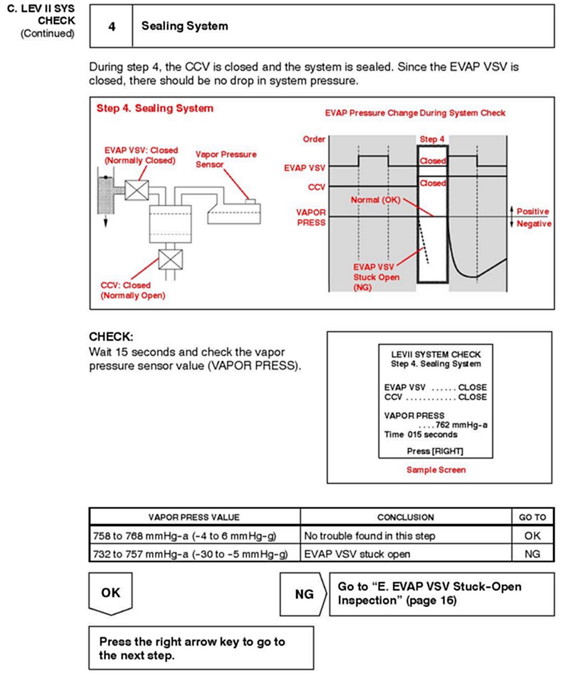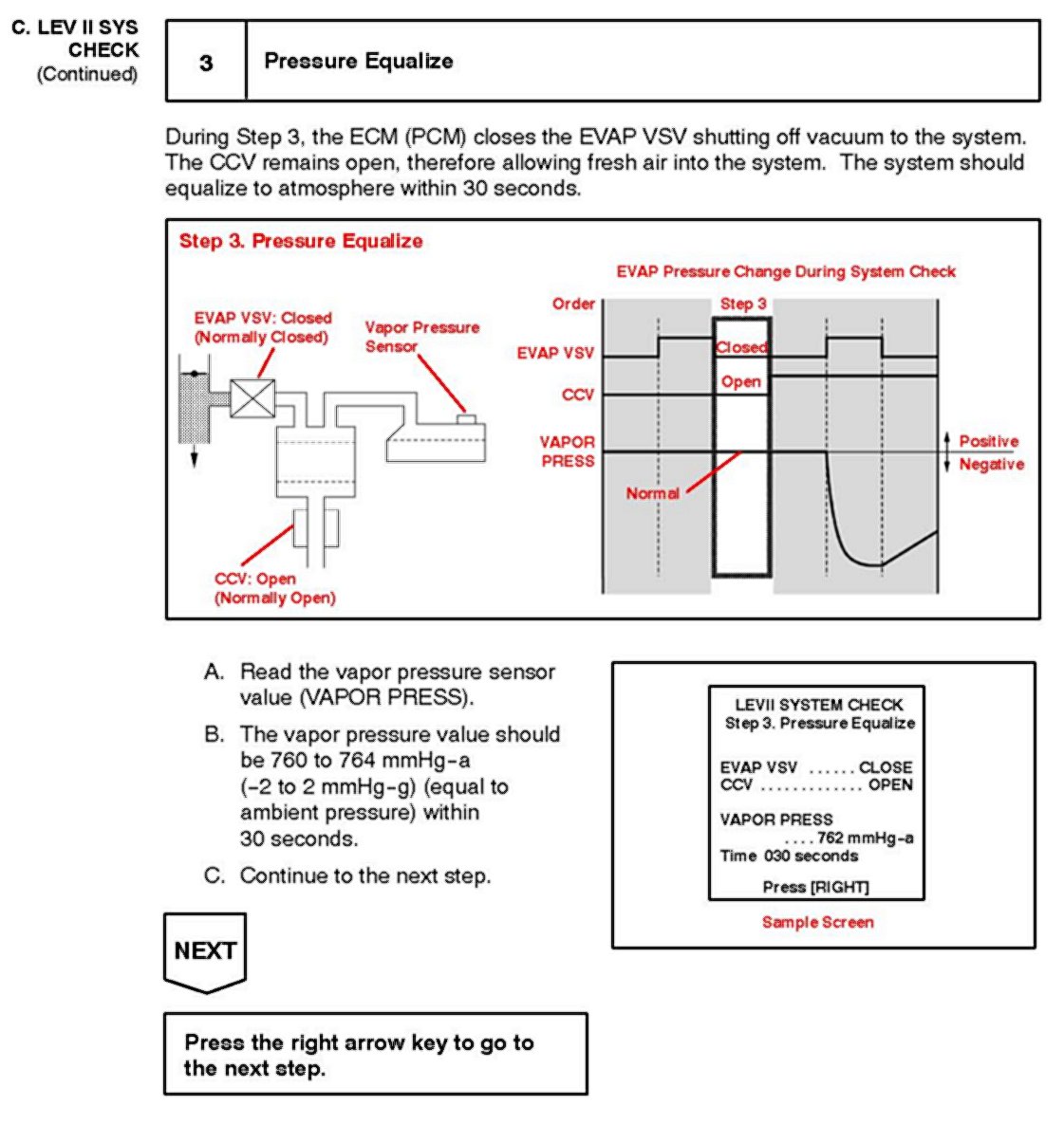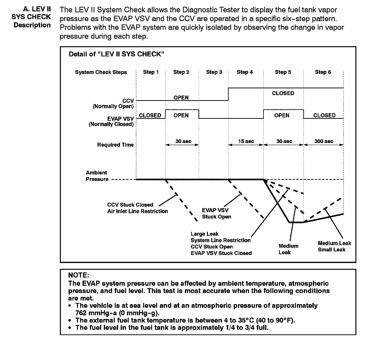 The LEV II System Check allows the Diagnostic Tester to display the fuel tank vapor pressure as the EVAP VSV and the CCV are operated in a specific six-step pattern. Problems with the EVAP system are quickly isolated by observing the change in vapor pressure during each step.