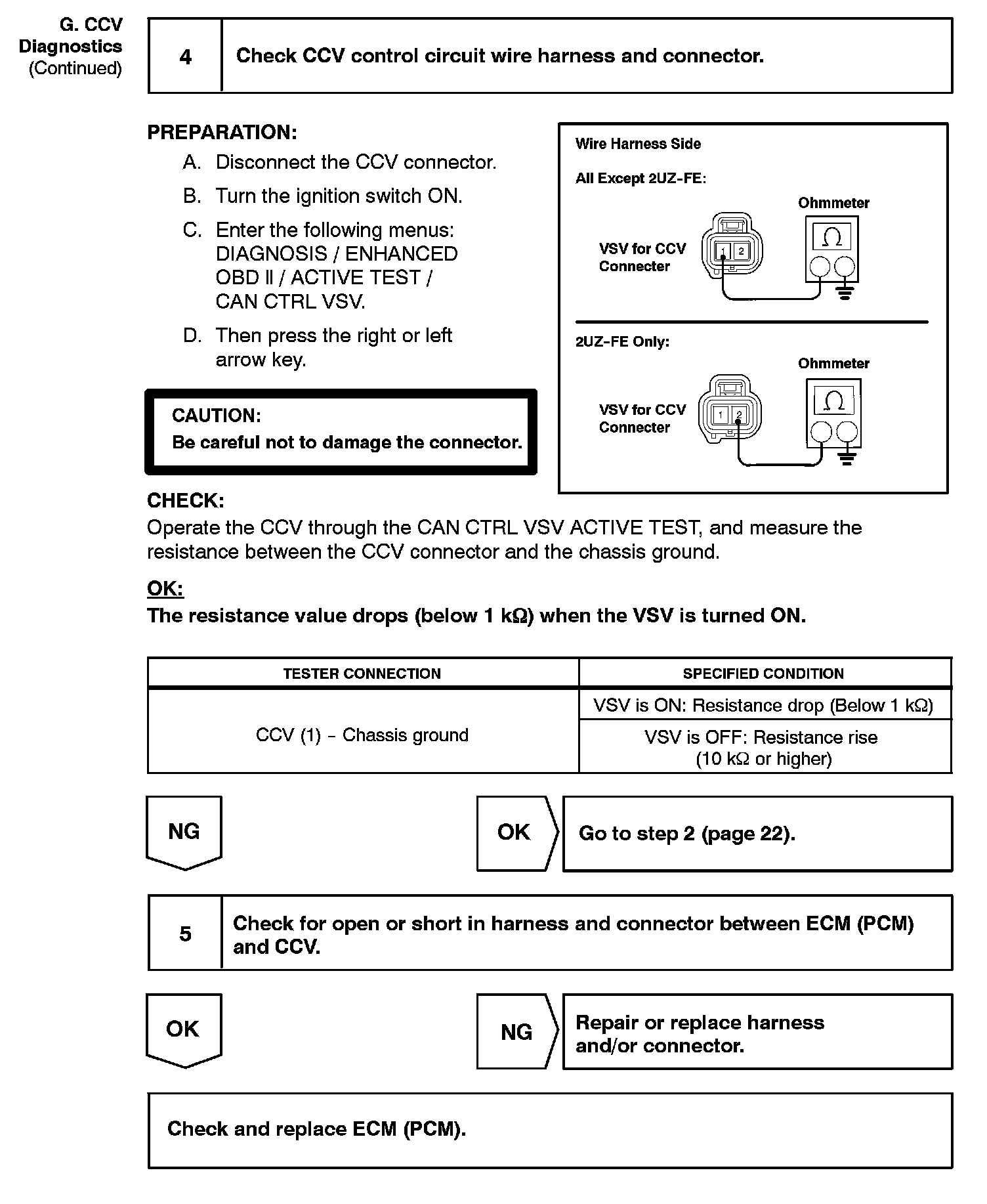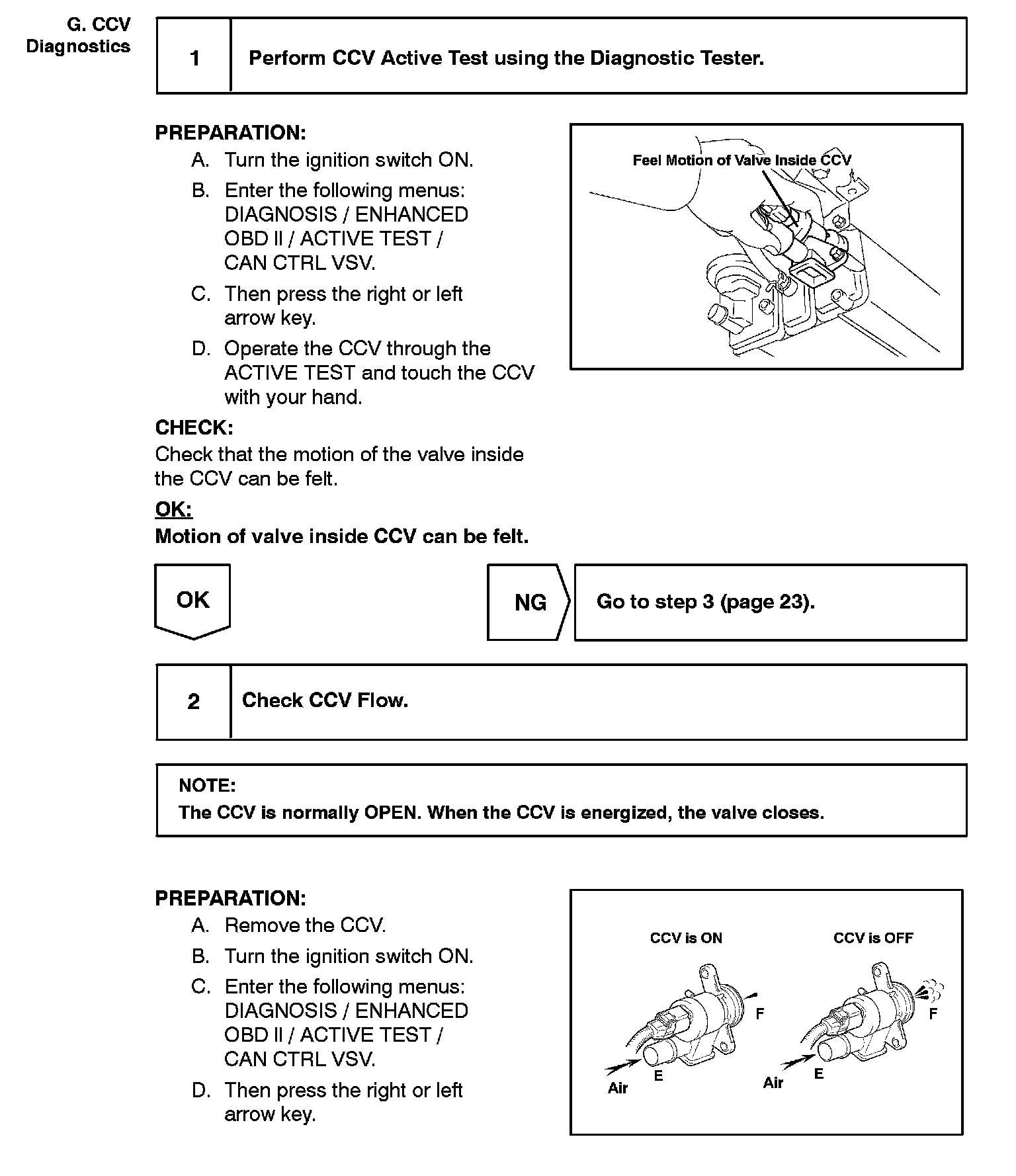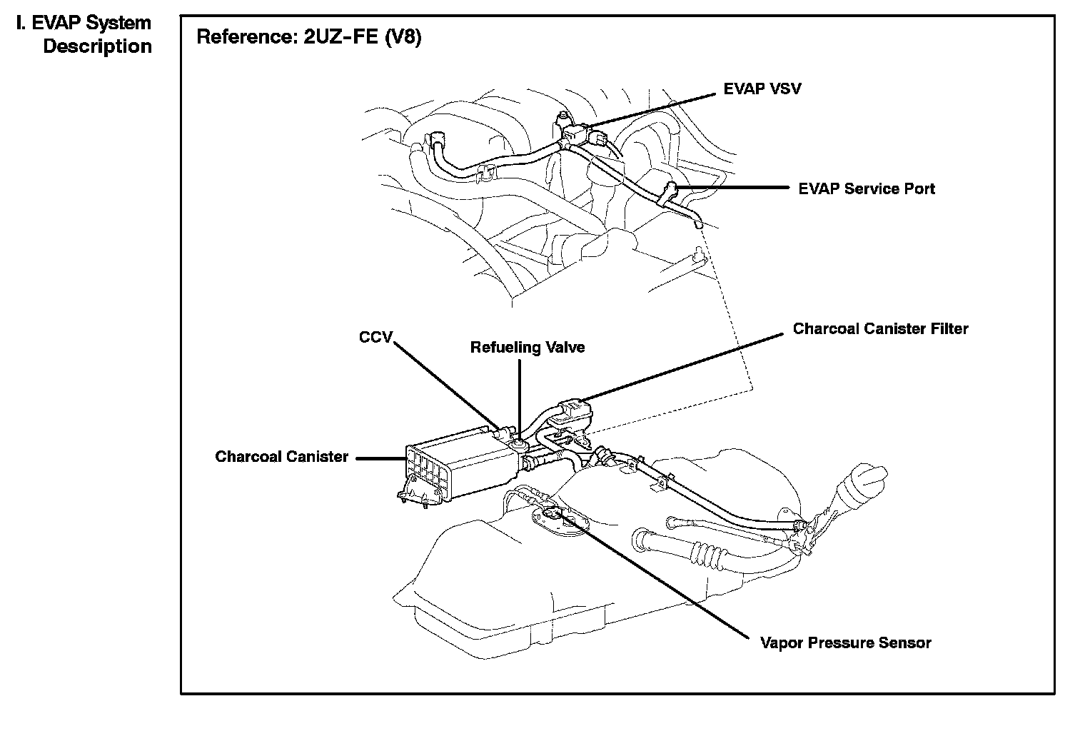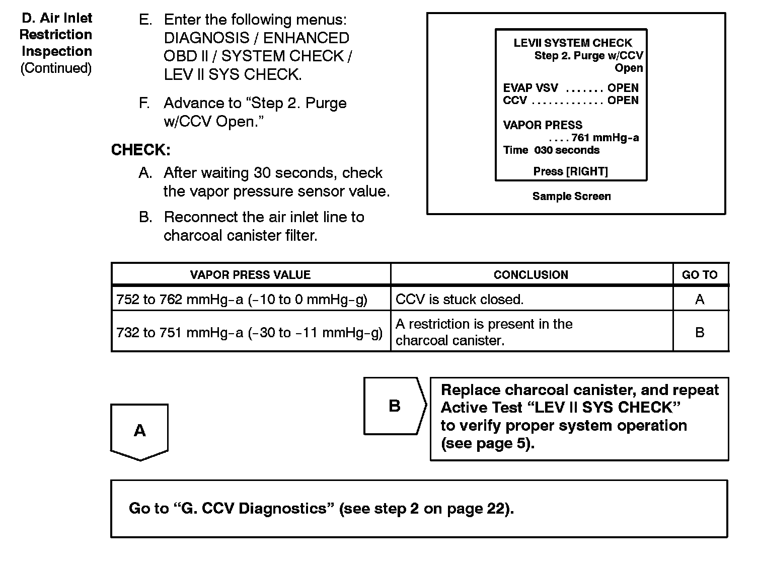 The LEV II System Check allows the Diagnostic Tester to display the fuel tank vapor pressure as the EVAP VSV and the CCV are operated in a specific six-step pattern. Problems with the EVAP system are quickly isolated by observing the change in vapor pressure during each step.