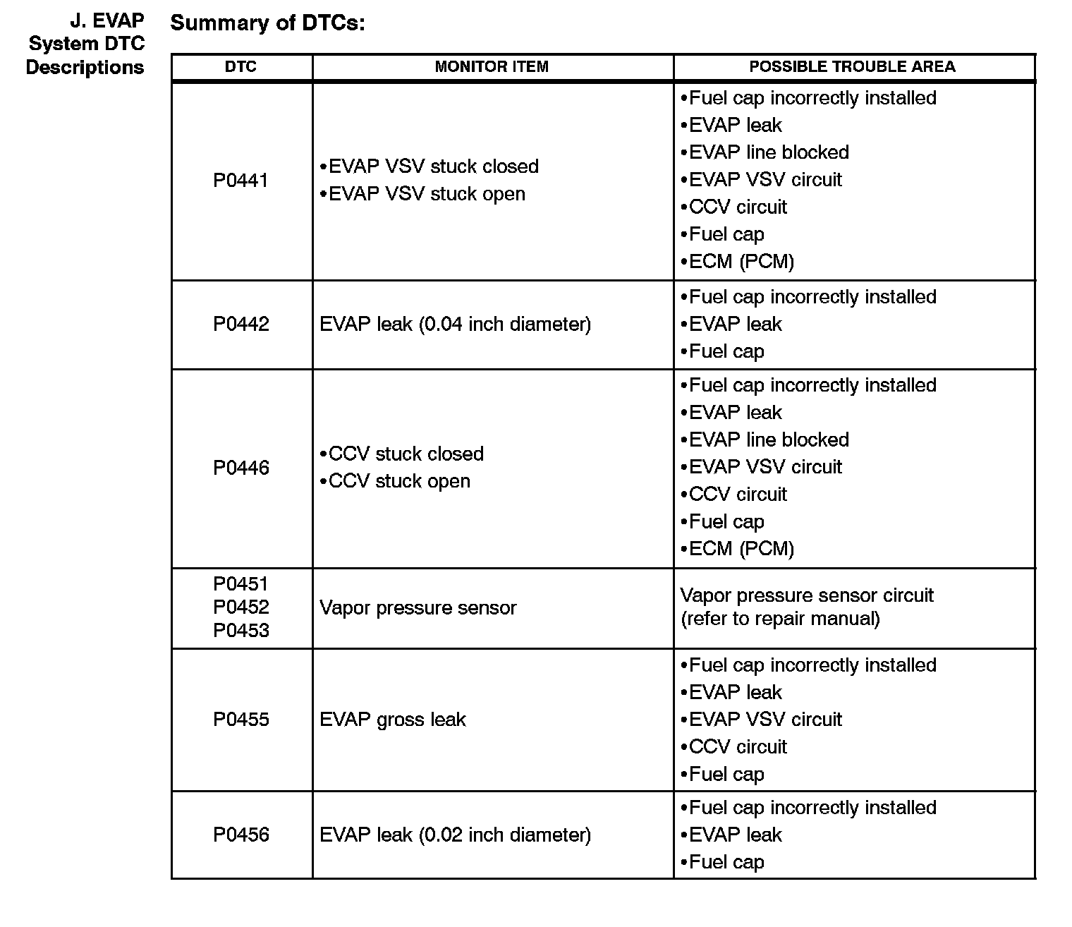 LEV II EVAP SYSTEM CHECK - DTC P0441, P0442, P0446, P0451, P0452, P0453, P0455 & P0456