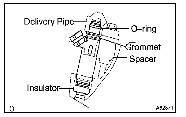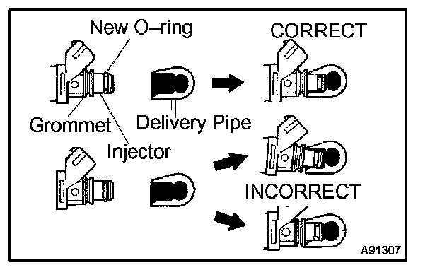 c. Install the injector to the delivery pipe and cylinder head, as shown in the illustration. Before installing the injector, be sure to apply grease or gasoline on the place where the delivery pipe contacts the O-ring of the injector.