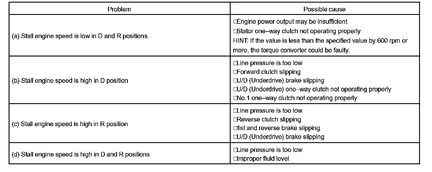 The object of this test is to check the overall performance of the transaxle and engine by measuring the stall speeds in the D and R positions.