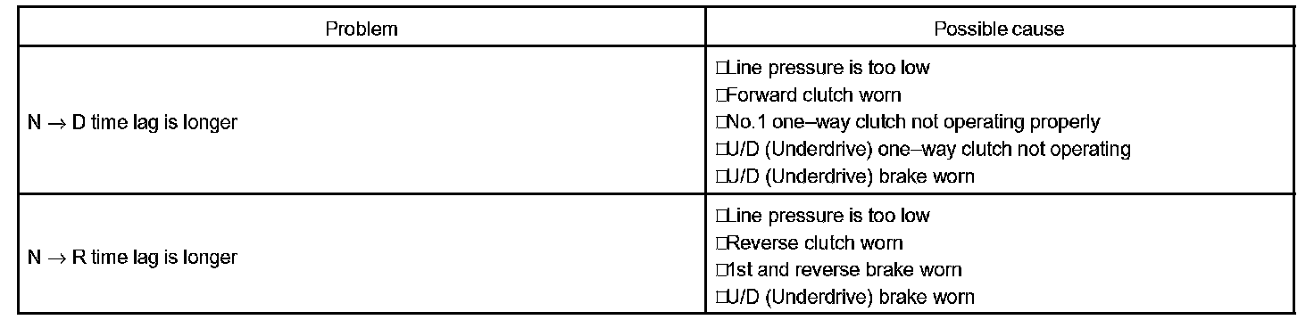1. When the shift lever is shifted while the engine is idling, there will be a certain time lapse or lag before the shock can be felt. This is used for checking the condition of the direct clutch, forward clutch, and 1st and reverse brake.