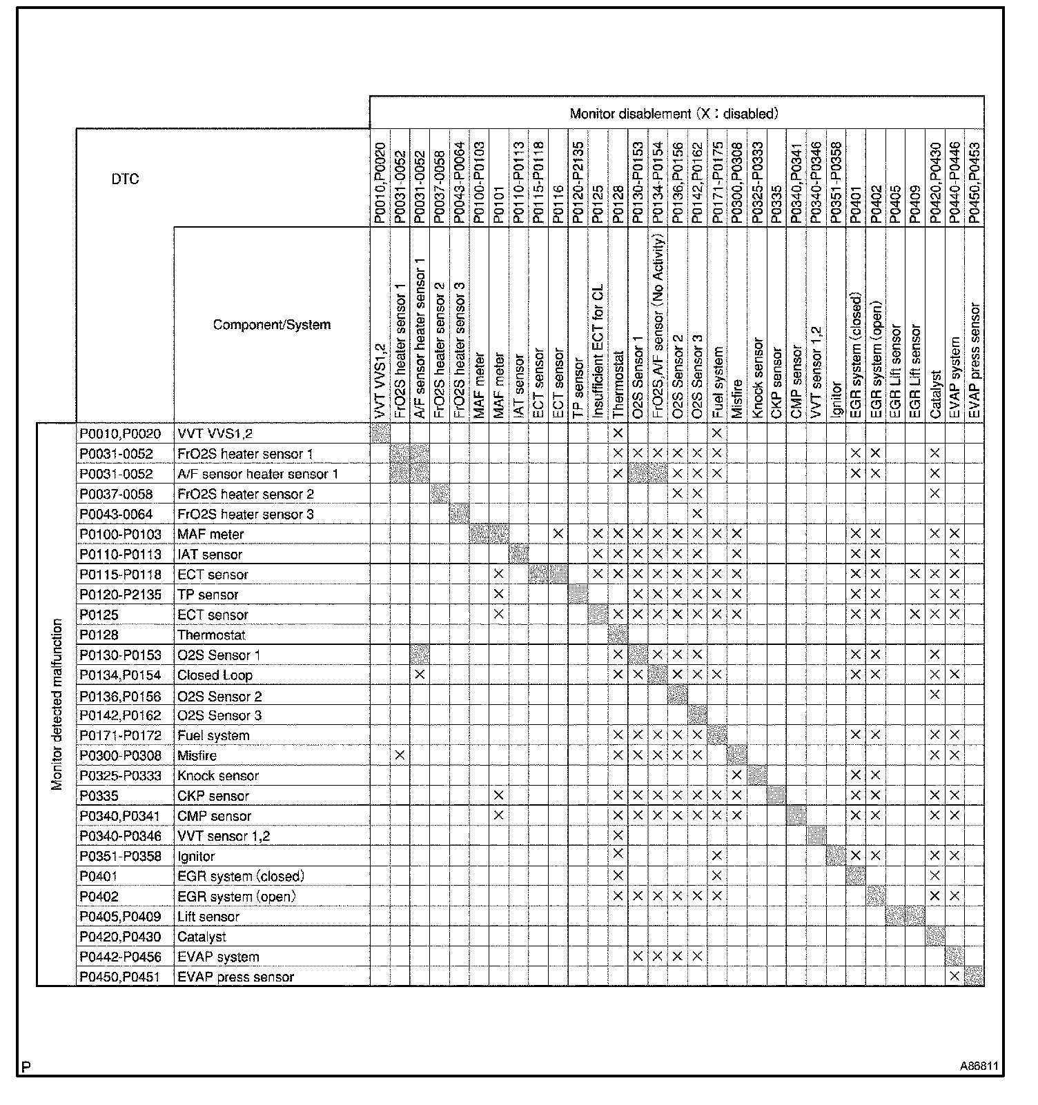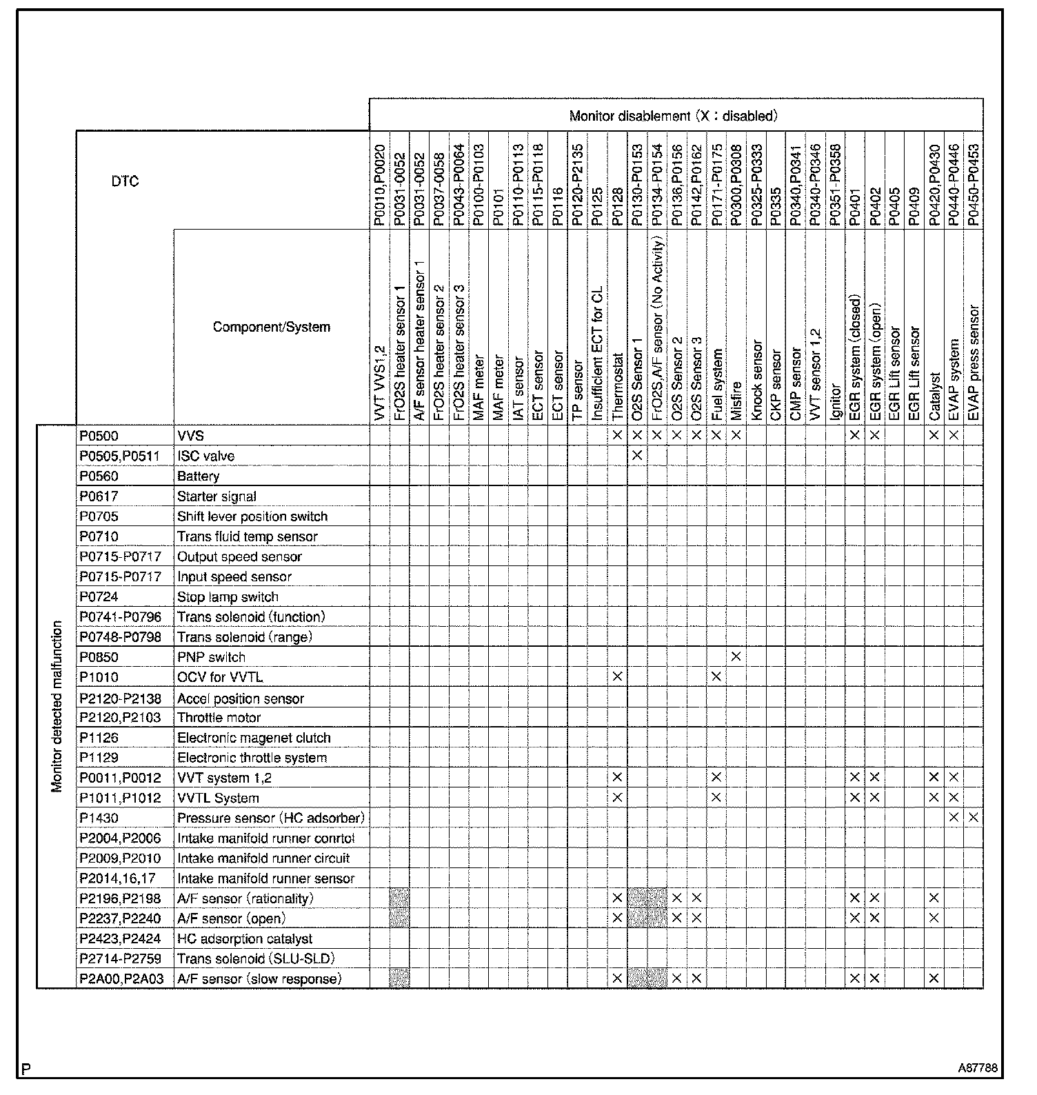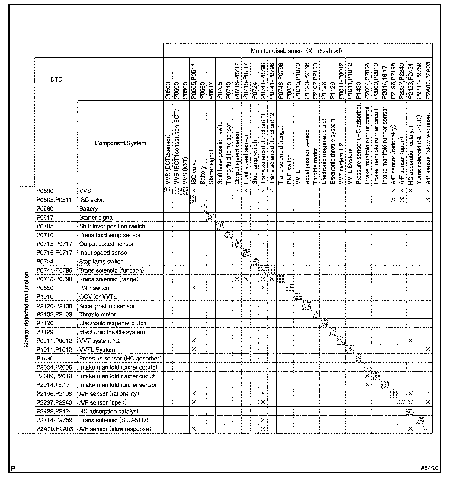 HINT: This table indicates ECM monitoring status for the items in the upper columns if the DTCs in each line on the left are being set.