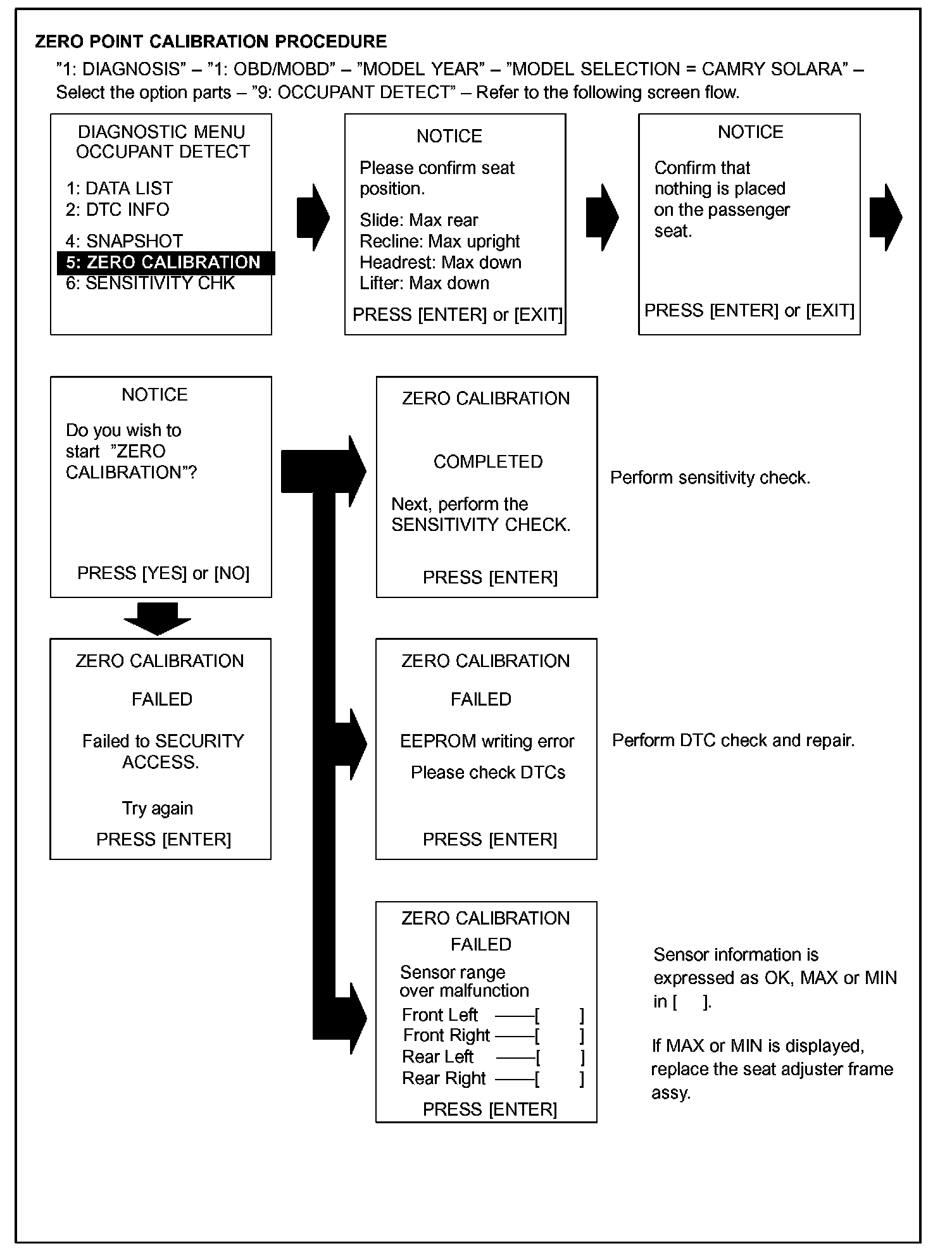 "1: DIAGNOSIS" - "1: OBD/MOBD" - "MODEL YEAR" - "MODEL SELECTION = CAMRY SOLARA" - Select the option parts - "9: OCCUPANT DETECT" - "5: ZERO CALIBRATION"