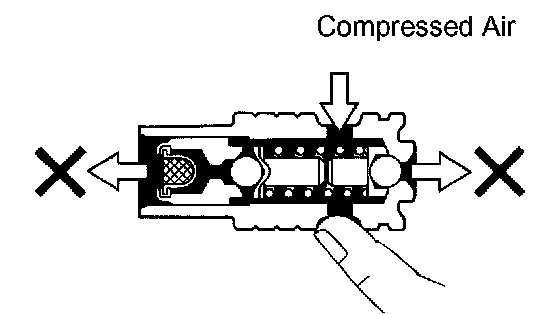 b. Check the flow control valve for leakage. Close one of the holes and apply compressed air, 392 to 490 kPa (4 to 5 kgf/cm2, 57 to 71 psi), into the opposite side hole, and confirm that air does not come out from the end holes.