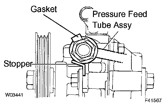 NOTICE: Make sure that the stopper of the pressure feed tube assy touches the bracket front as shown in the illustration, then tighten the union bolt.