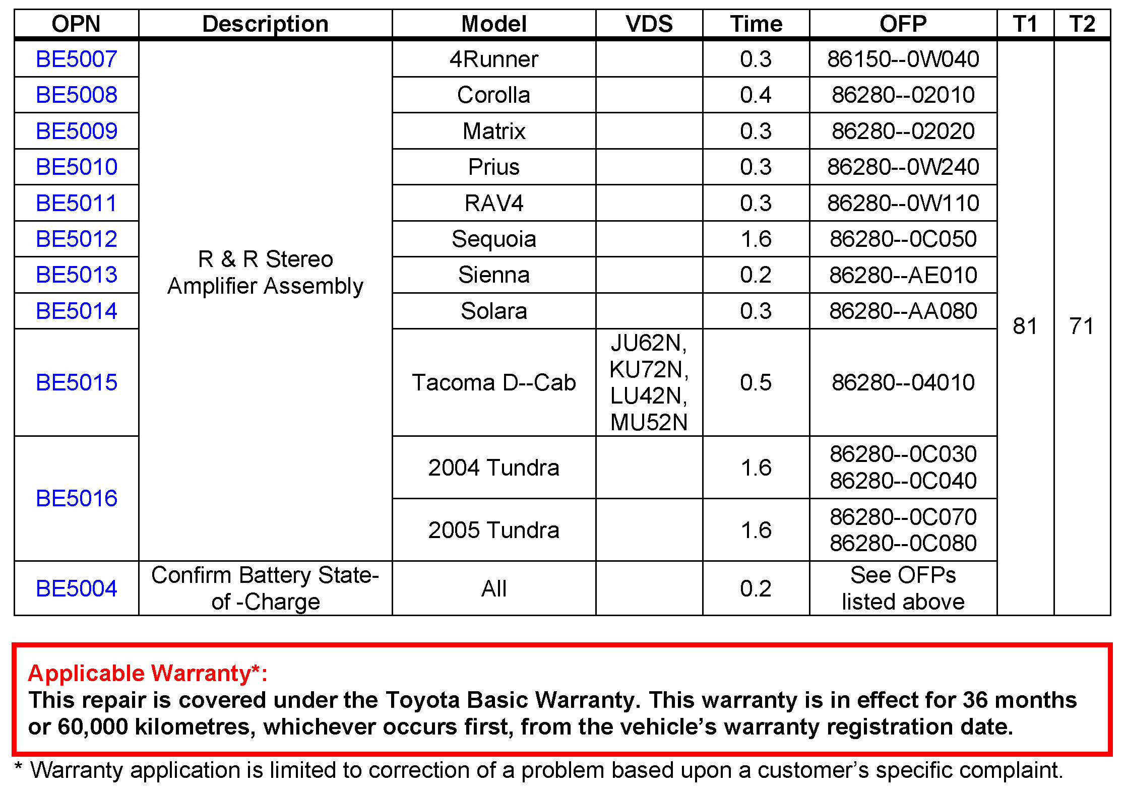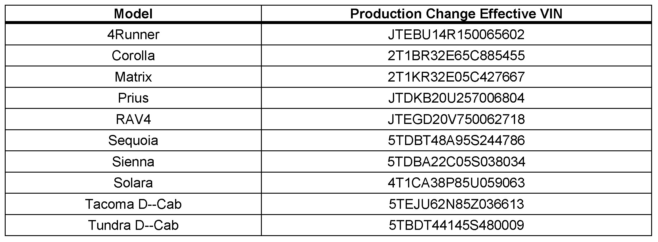 - 2005 model year Corolla, Matrix, Sequoia, and Tacoma vehicles equipped with the JBL audio system produced BEFORE the Production Change Effective VINs.