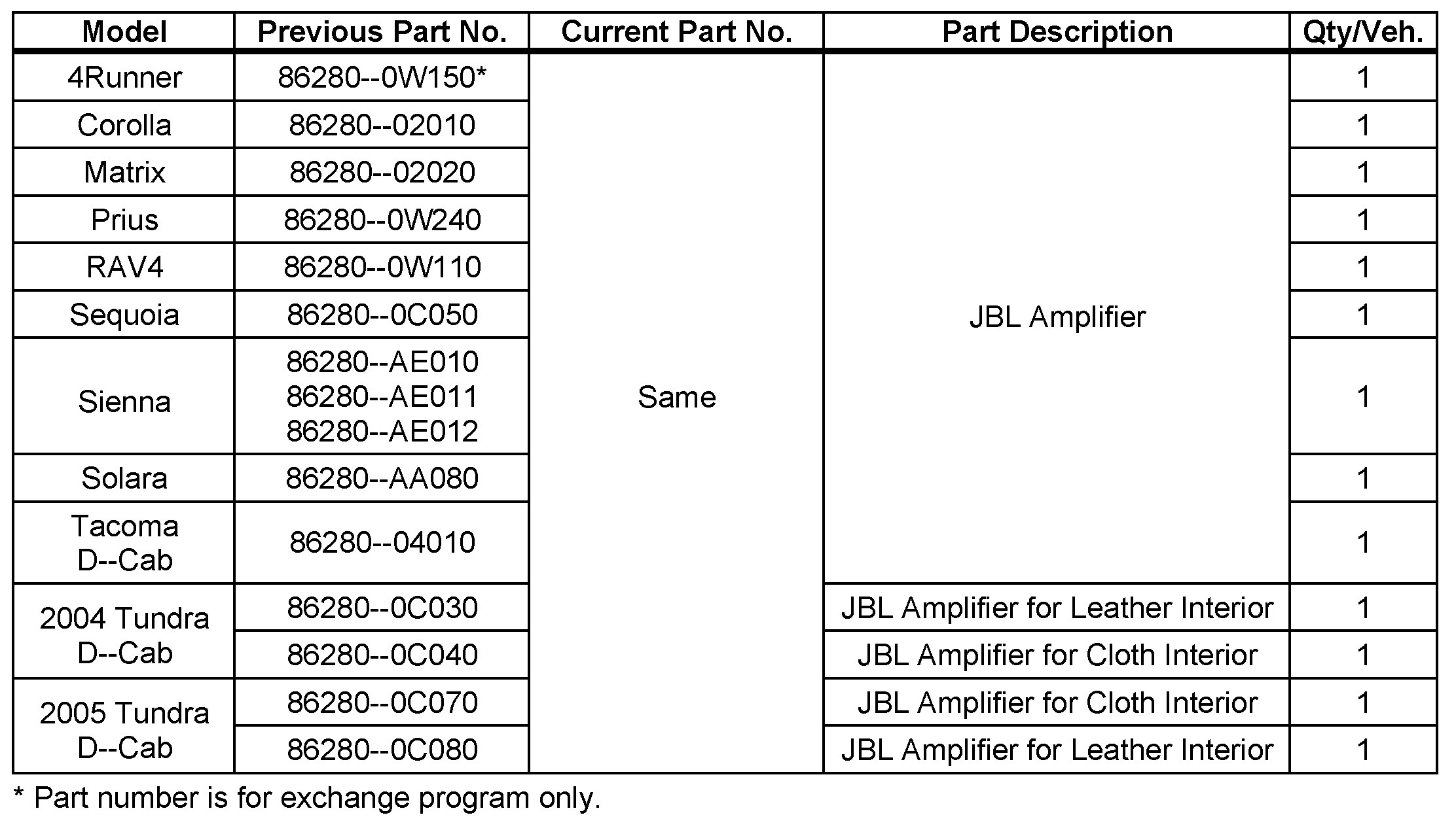 - 2004 - 2005 model year 4Runner, Prius, RAV4, Sienna, Solara, and Tundra vehicles equipped with the JBL audio system produced BEFORE the Production Change Effective VINs.