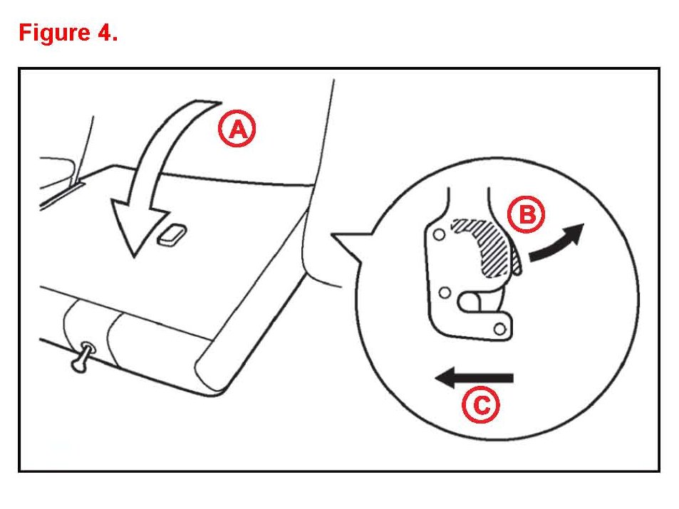 (3) Remove the rear seatback assembly RH by folding the seatback forward pulling the spring loaded hammer and pulling the seat towards the front of the vehicle.