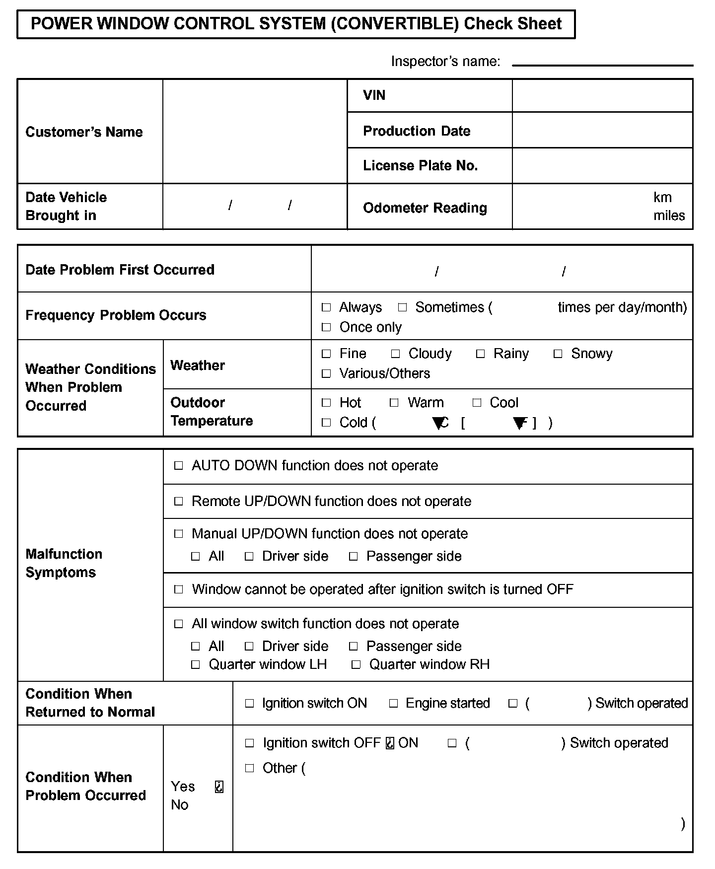 Power Windiow Control System (Convertible) Check Sheet: