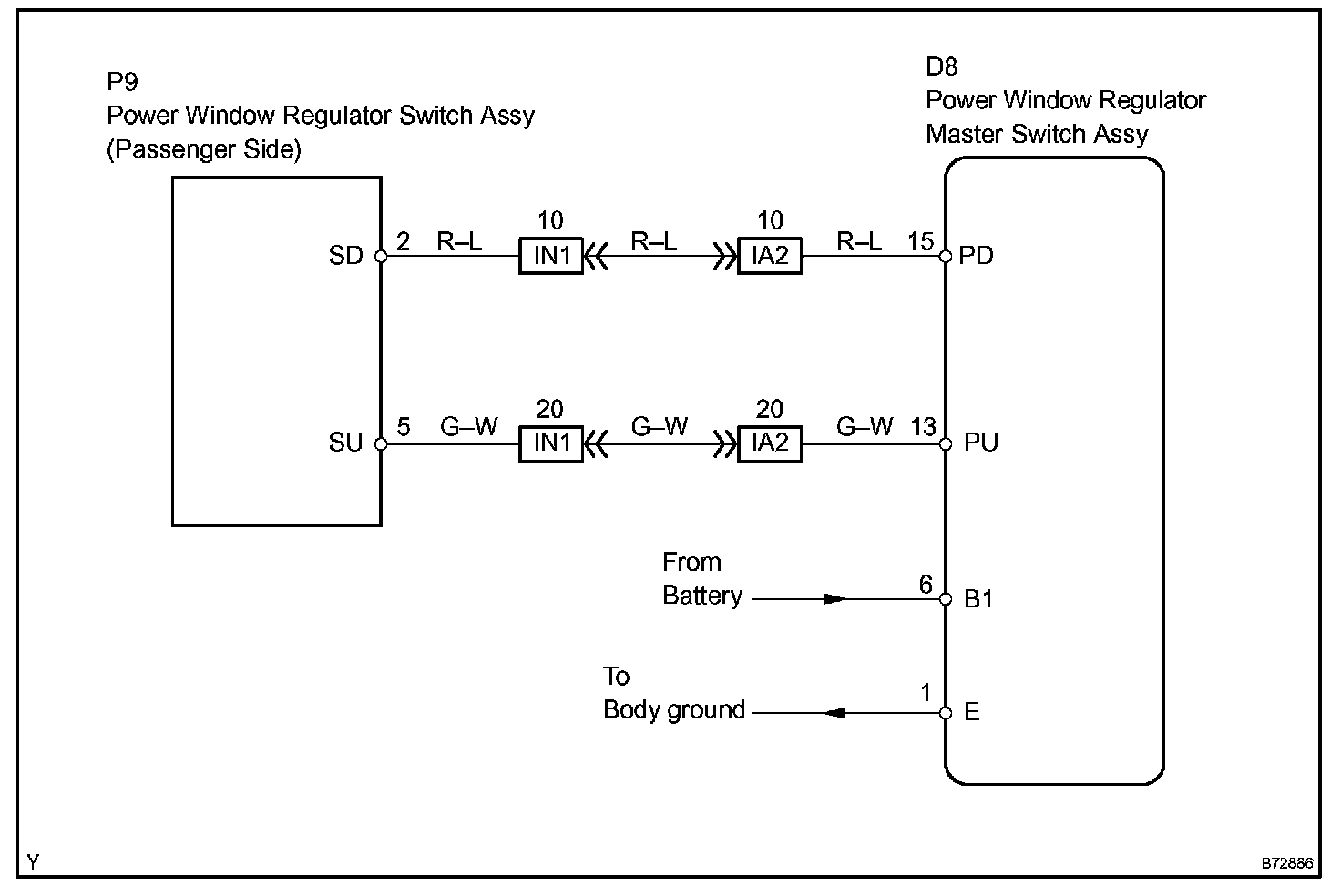 With the ignition switch ON, the power window regulator master switch transmits remote switch signals to the passenger side power window regulator switch. Then, the regulator switch drives the power window regulator motor.
