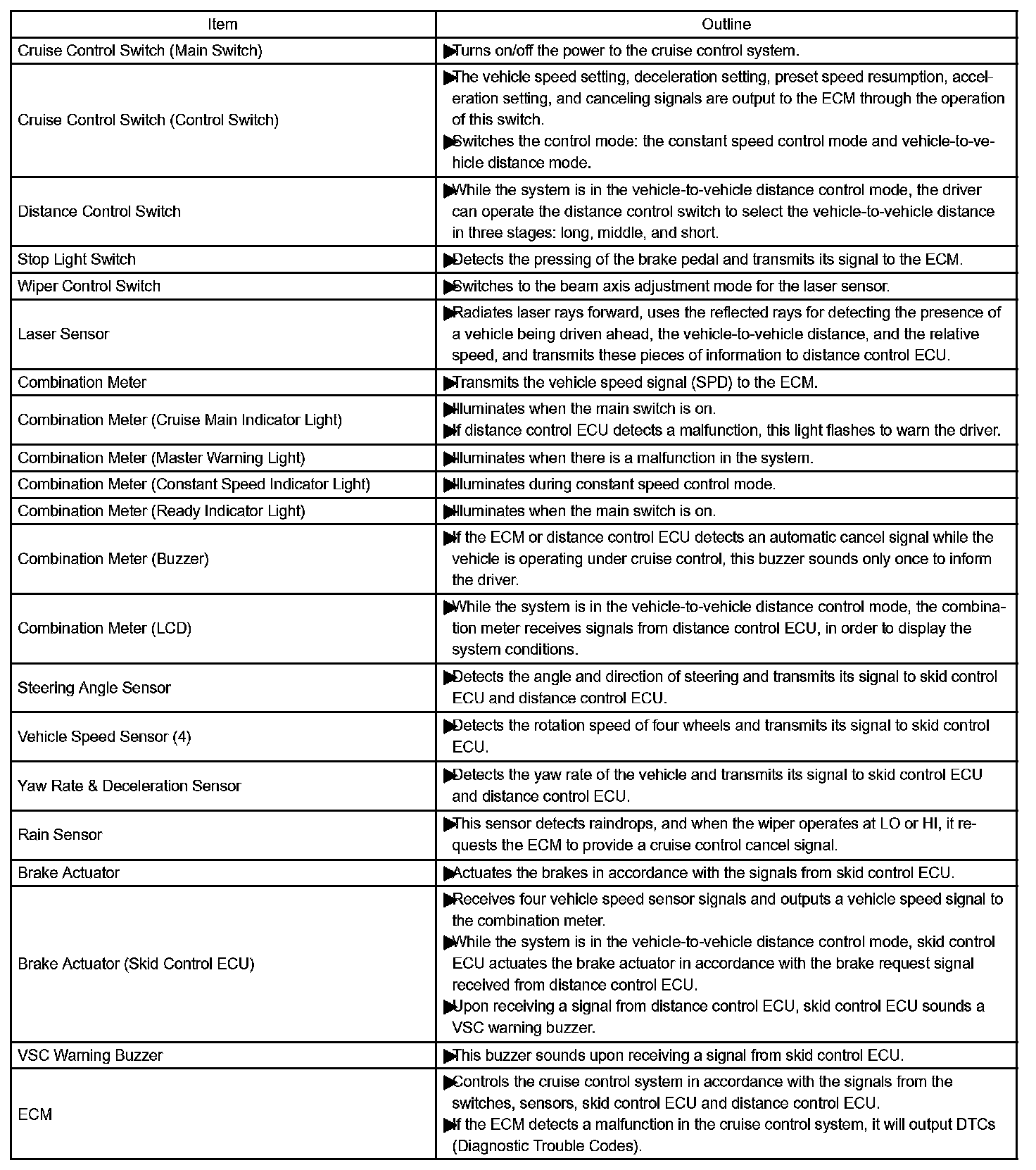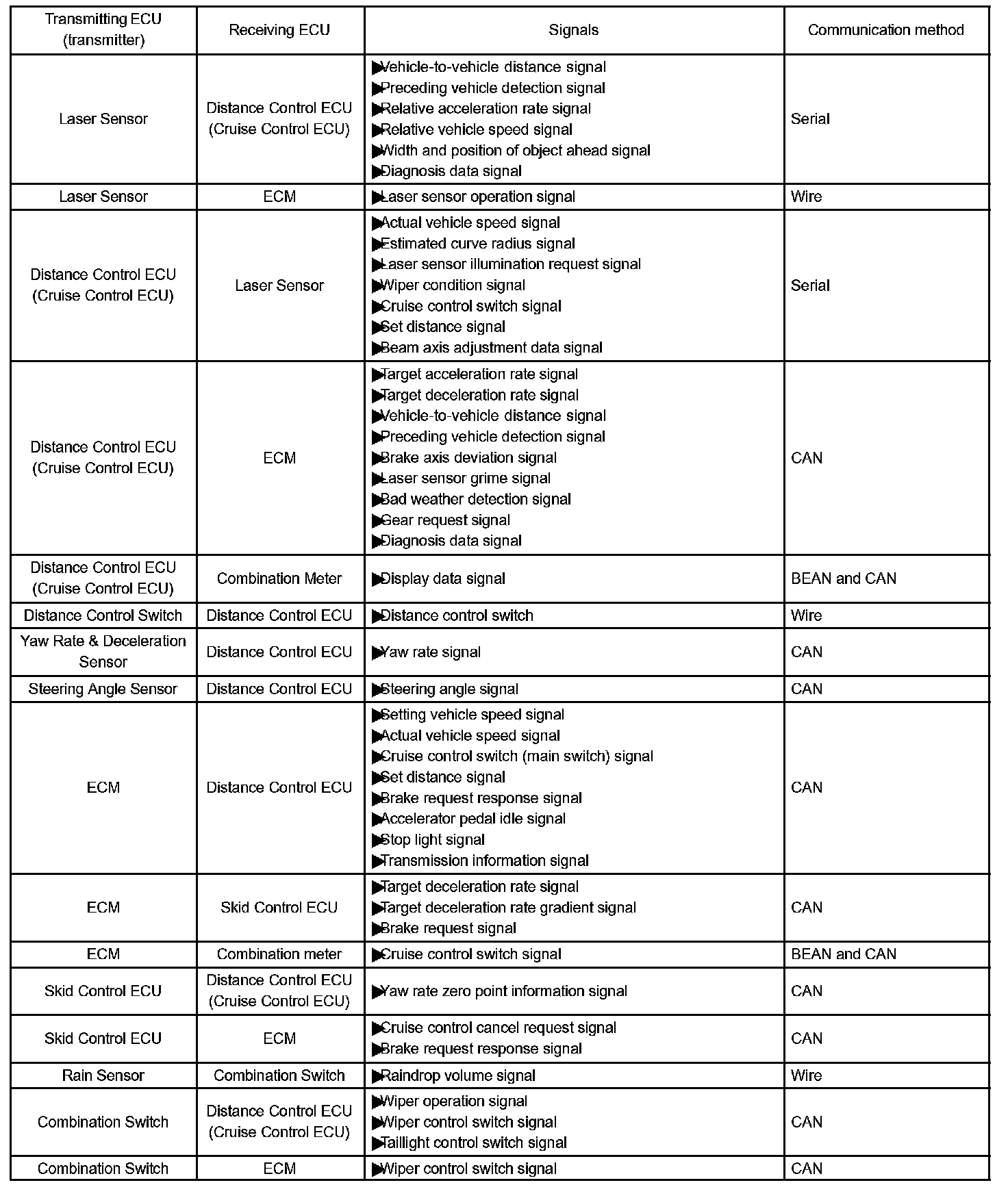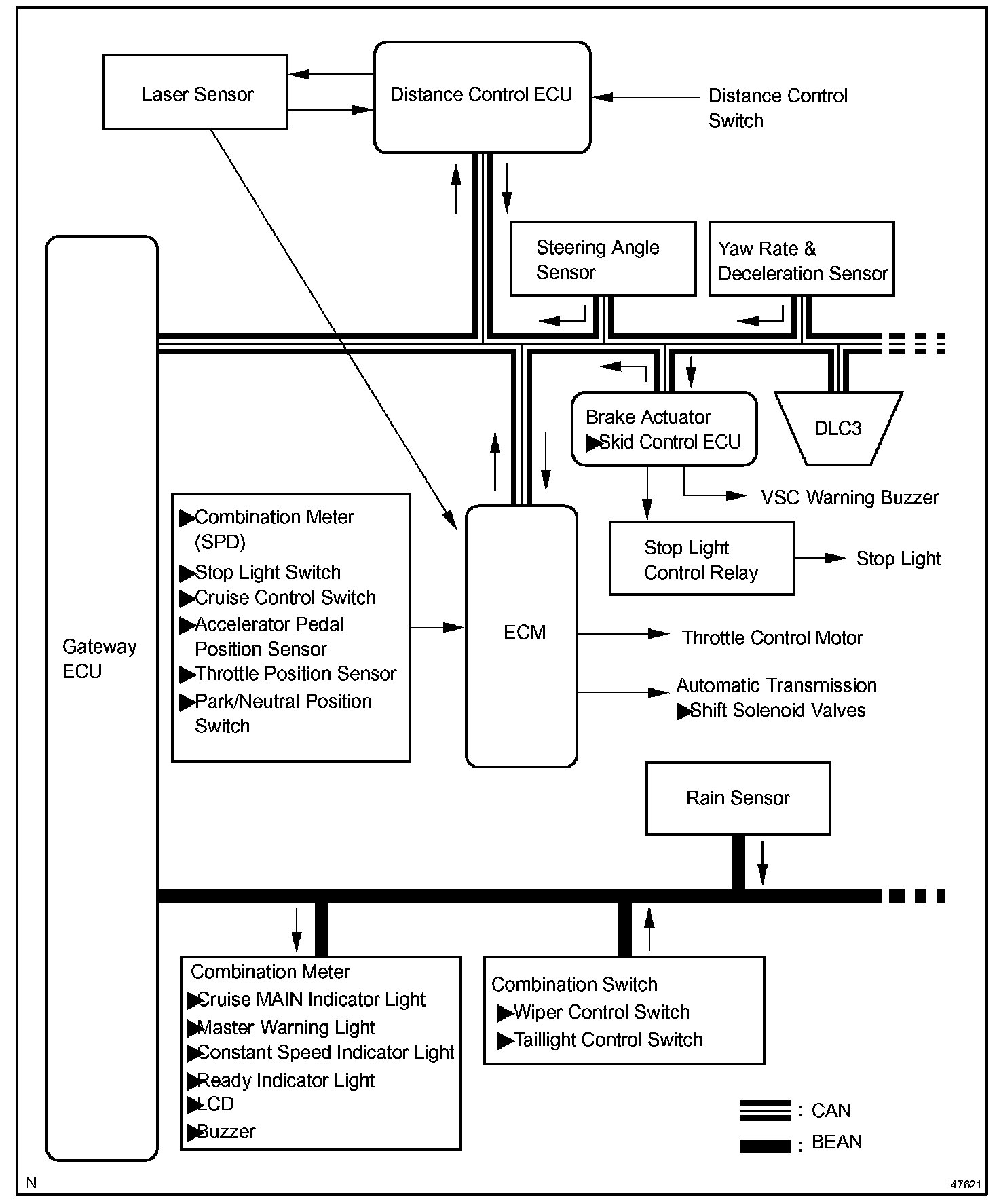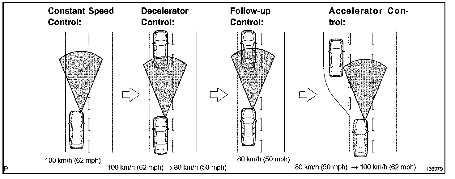 The distance control ECU (cruise control ECU) determines the distance between a vehicle in front and your own, relative speed, target decreasing speed and deceleration rate to transmit a brake demand signal to the skid control ECU via the ECM.