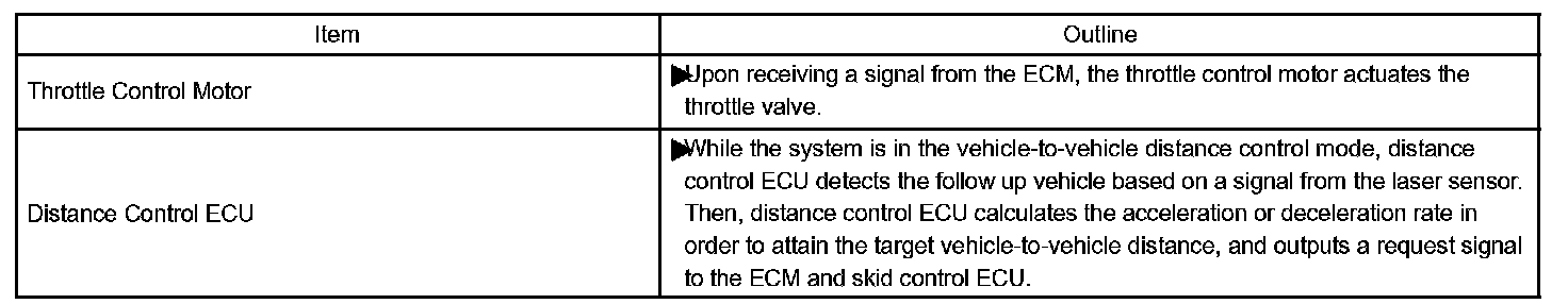 d. The laser sensor and the distance control ECU (cruise control ECU) control the system while the vehicle-to-vehicle distance control mode is in operation, and send signals to each actuator and ECU.