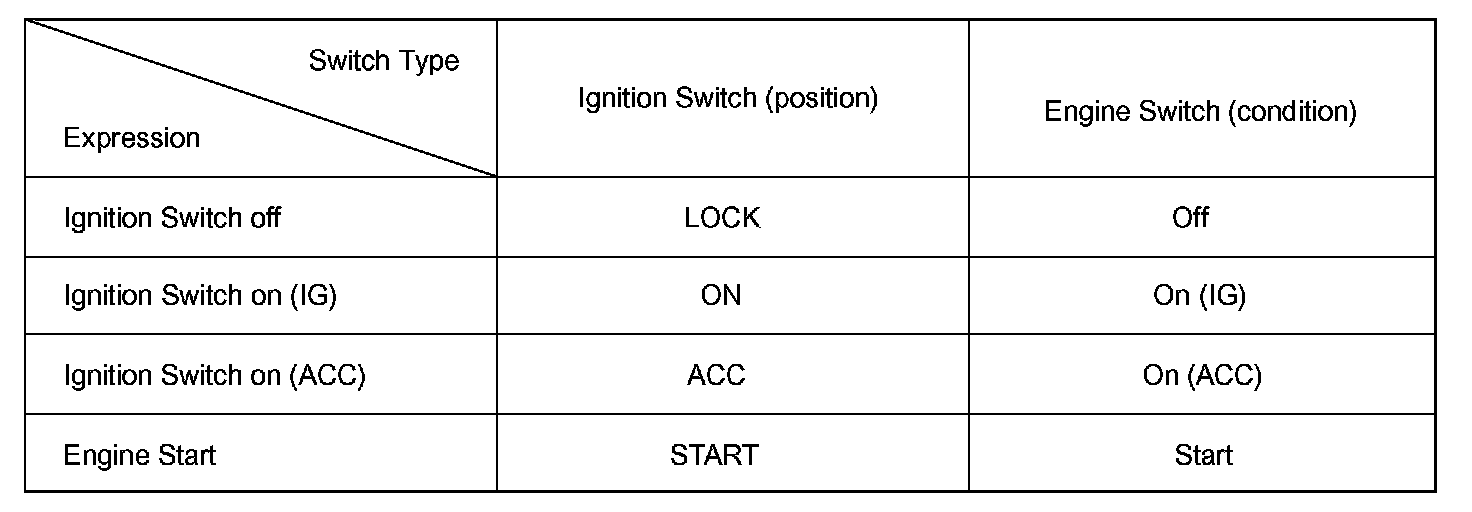 The type of ignition switch used on this model differs according to the specifications of the vehicle. The expressions listed in the table are used in this section.