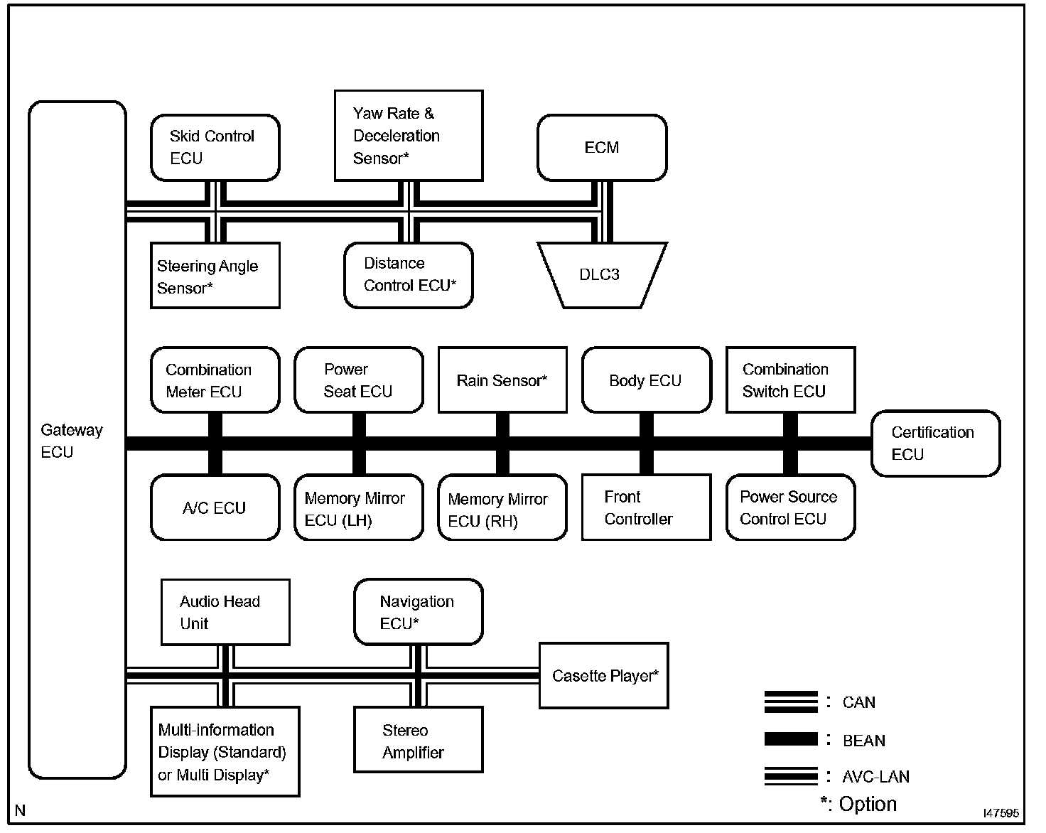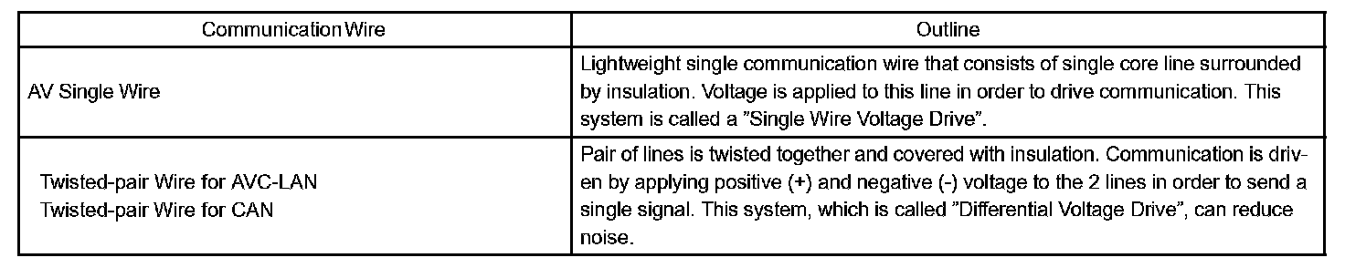A single, Automobile Vinyl (AV) wire is used for BEAN communication. A twisted-pair wire is used for CAN and AVC-LAN communication.