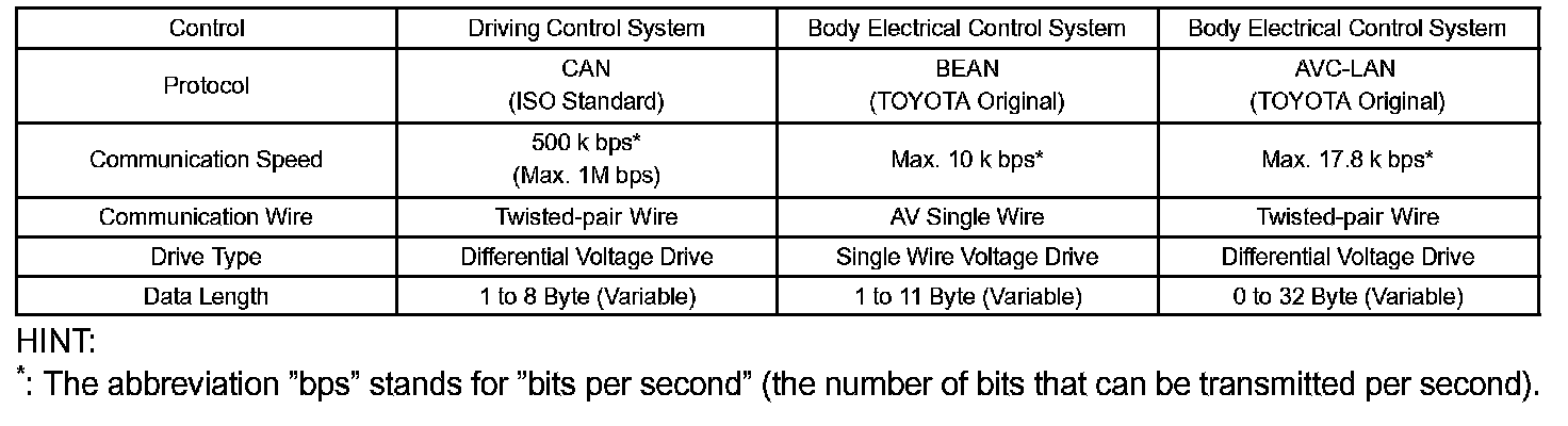 Protocols, which are rules for establishing data communication, differ between the CAN, BEAN and the AVC-LAN. If ECUs use different types of data such as communication speed, communication wire, and signals, they will be unable to communicate with each other. Therefore, protocols (rules) must be established among them.