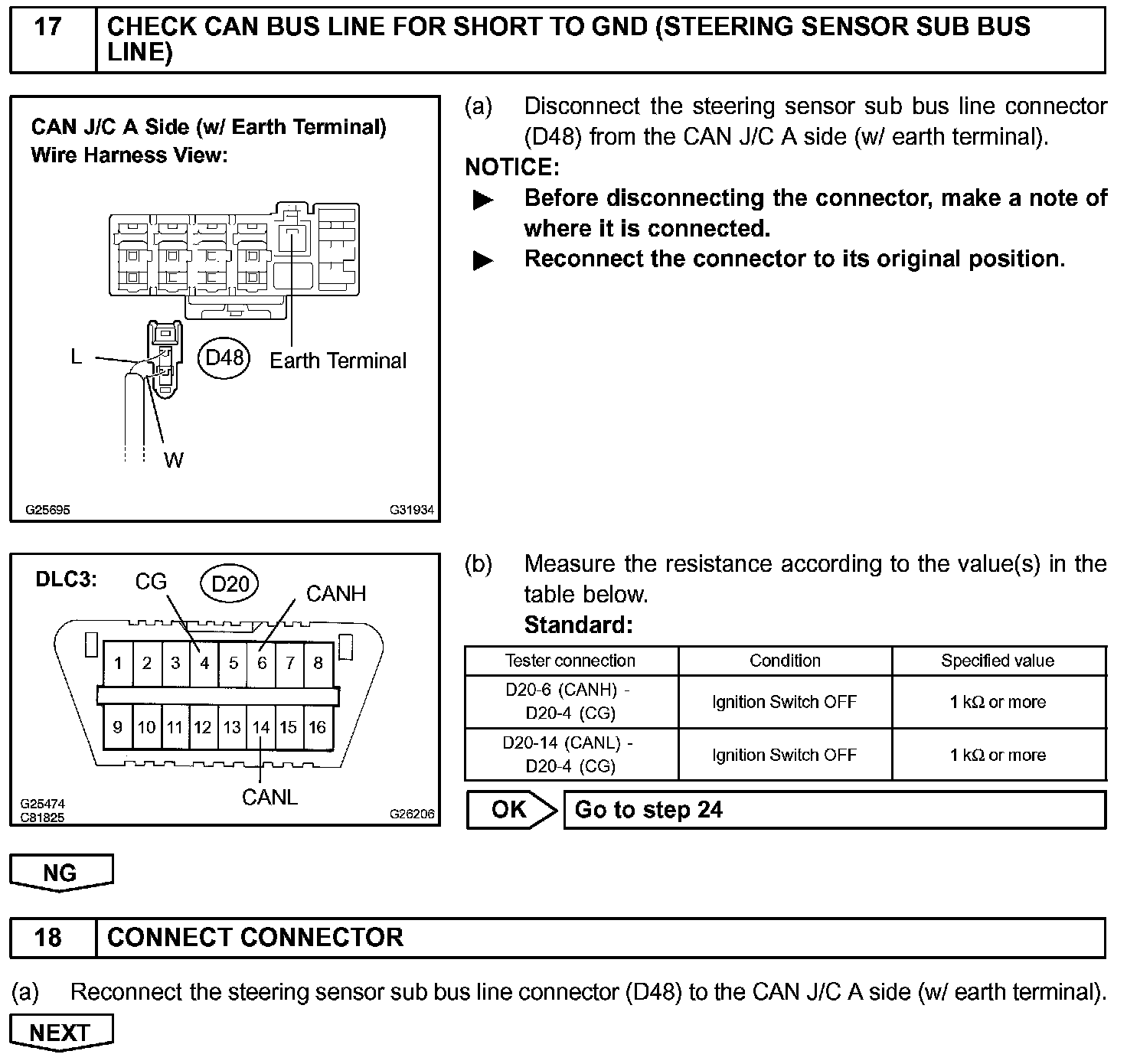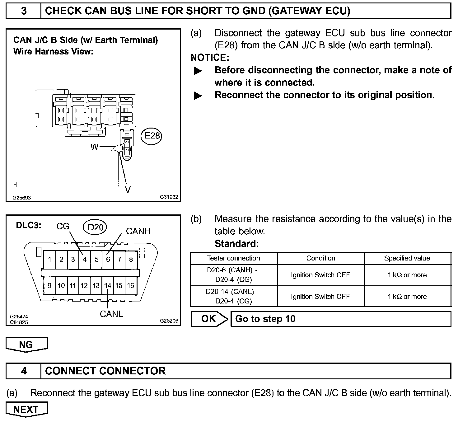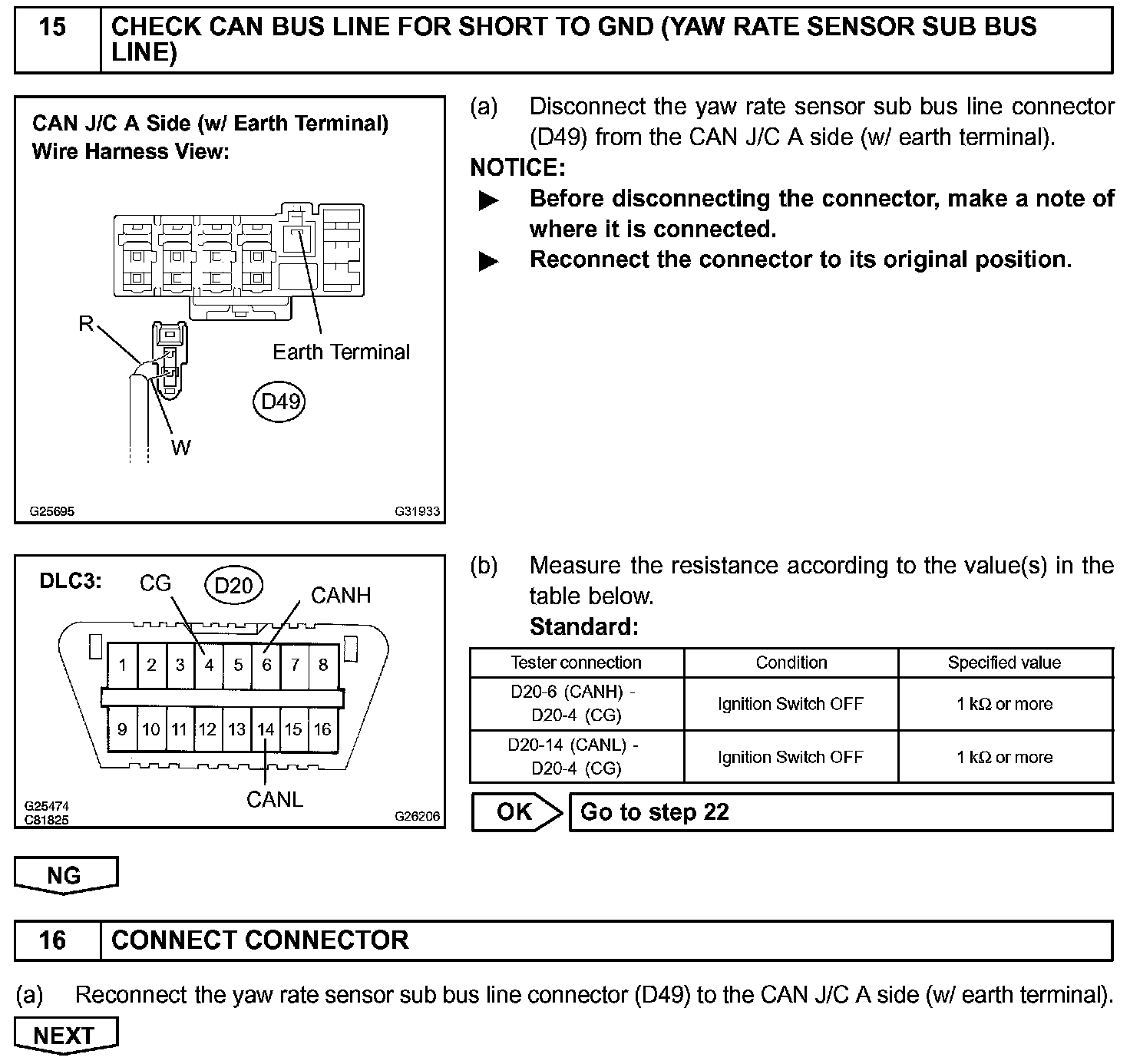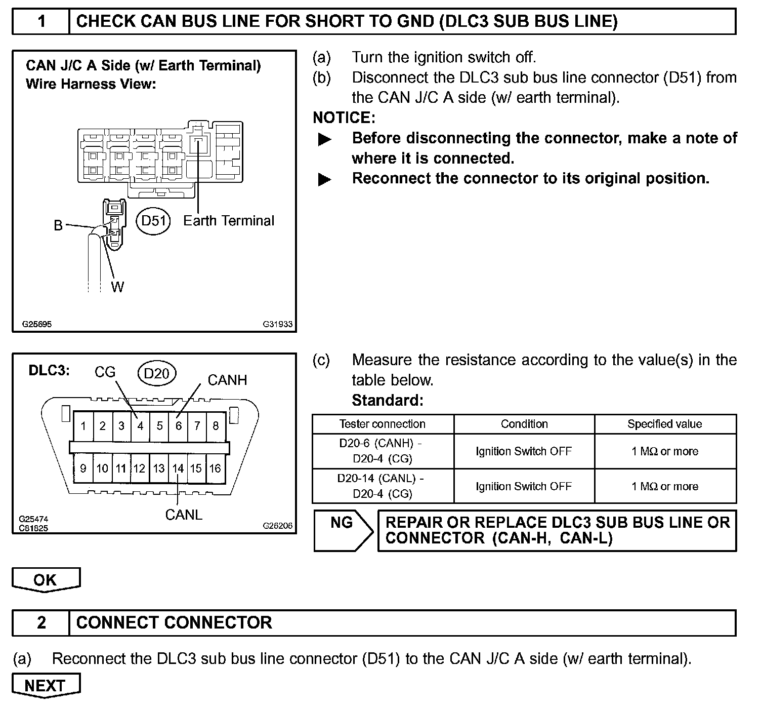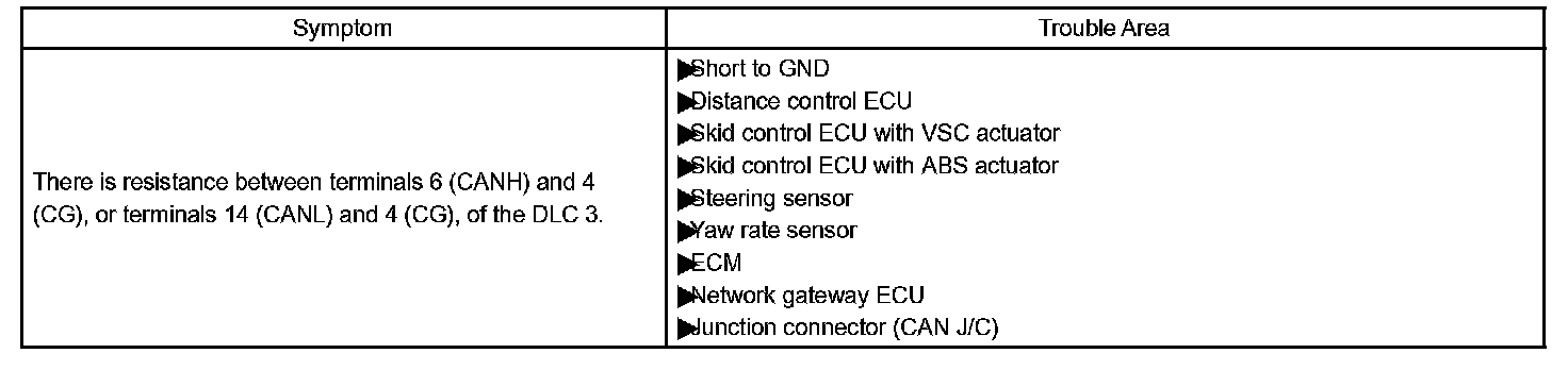 There may be a short circuit between the CAN bus line and GND when there is resistance between terminals 6 (CANH) and 4 (CG), or terminals 14 (CANL) and 4 (CG), of the DLC3.