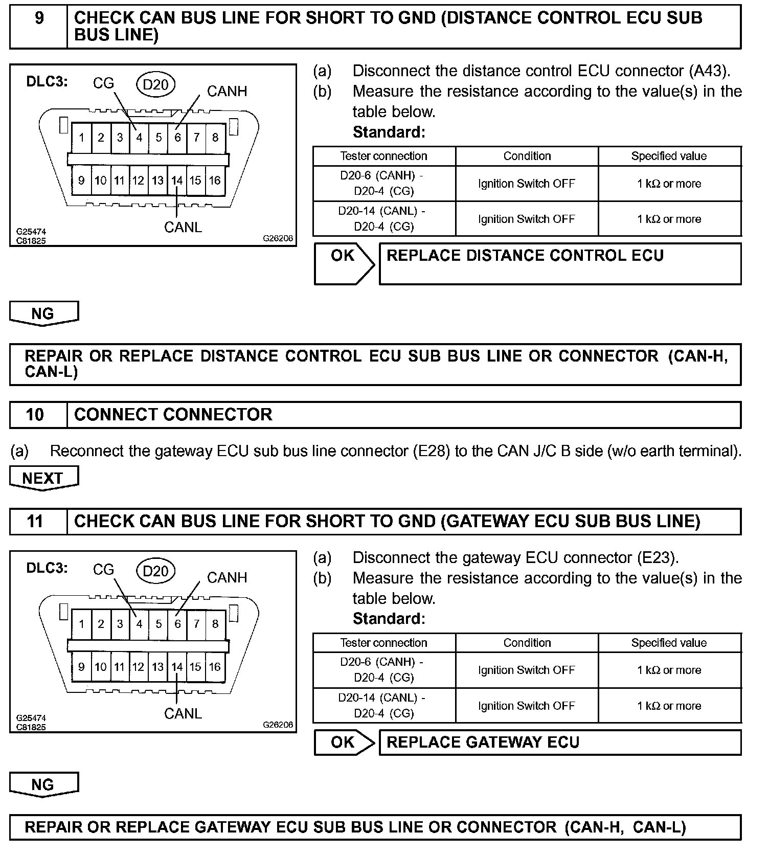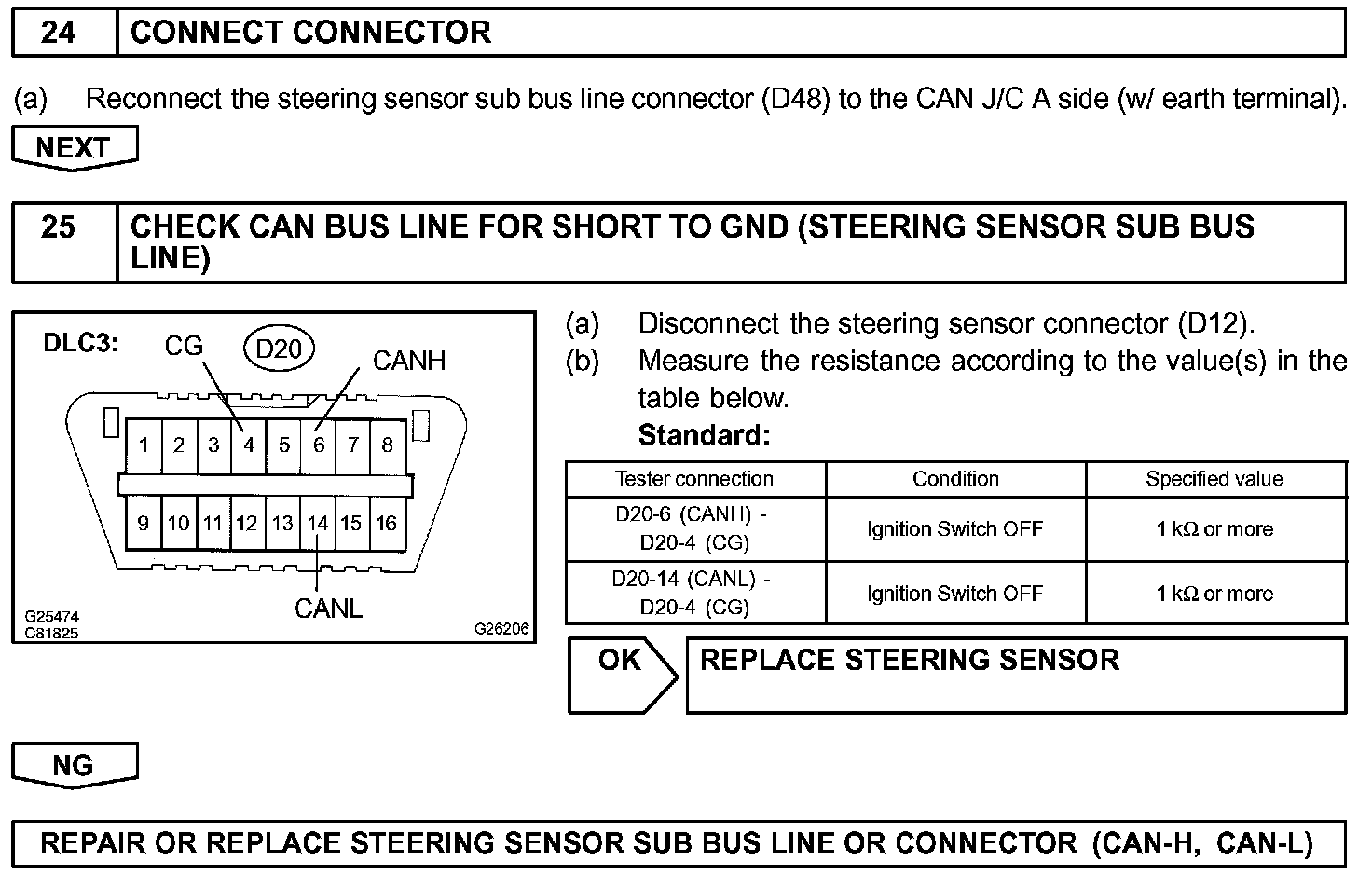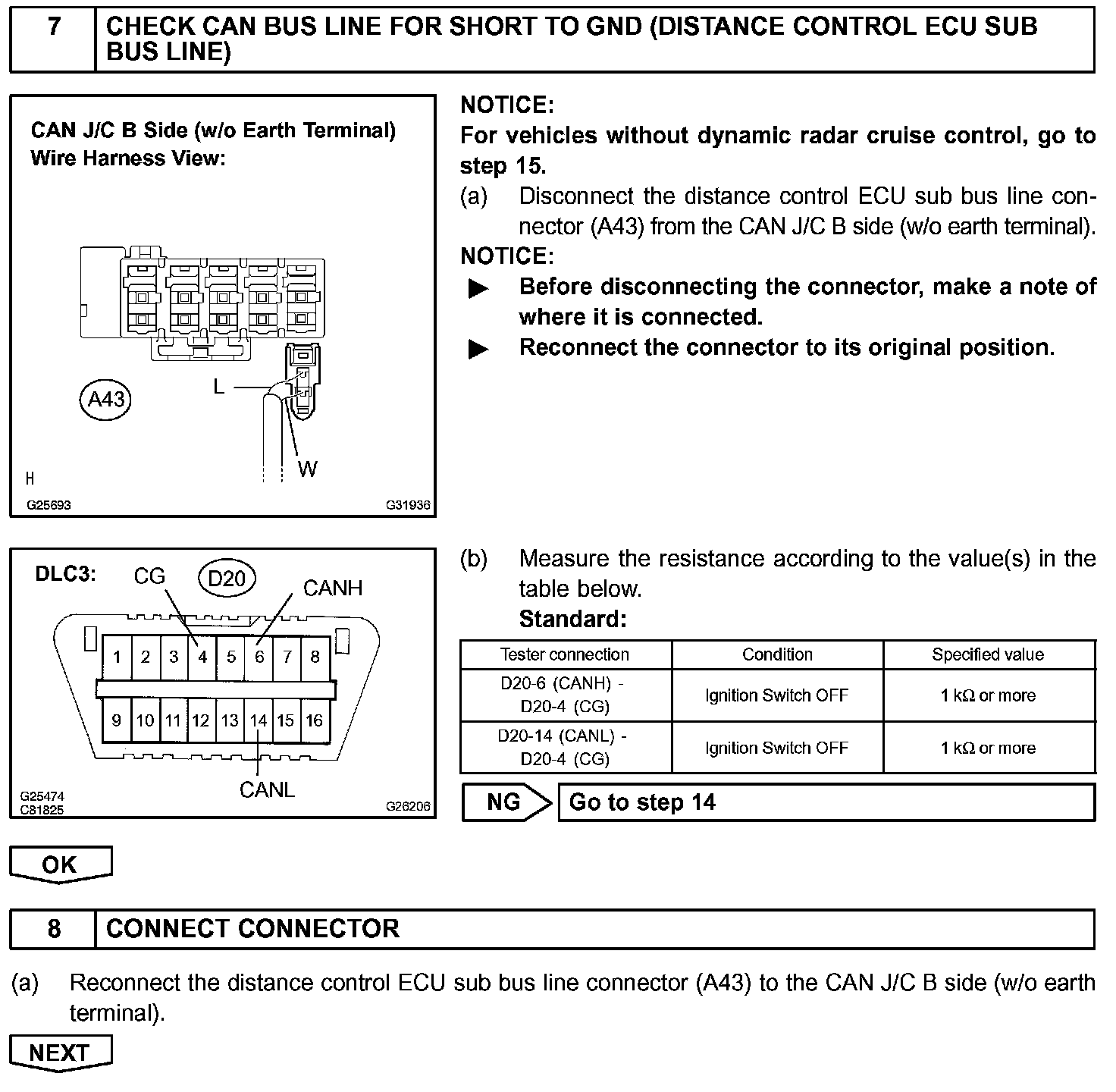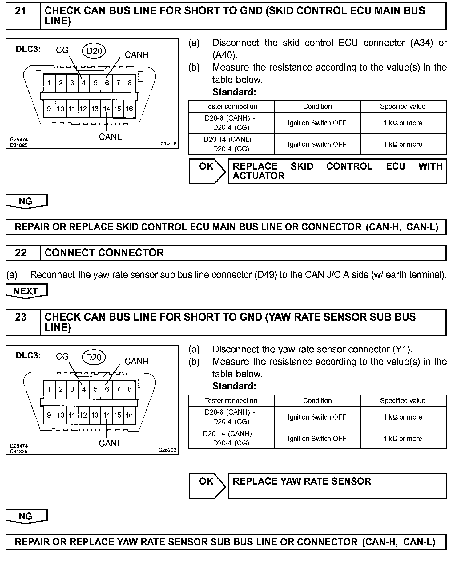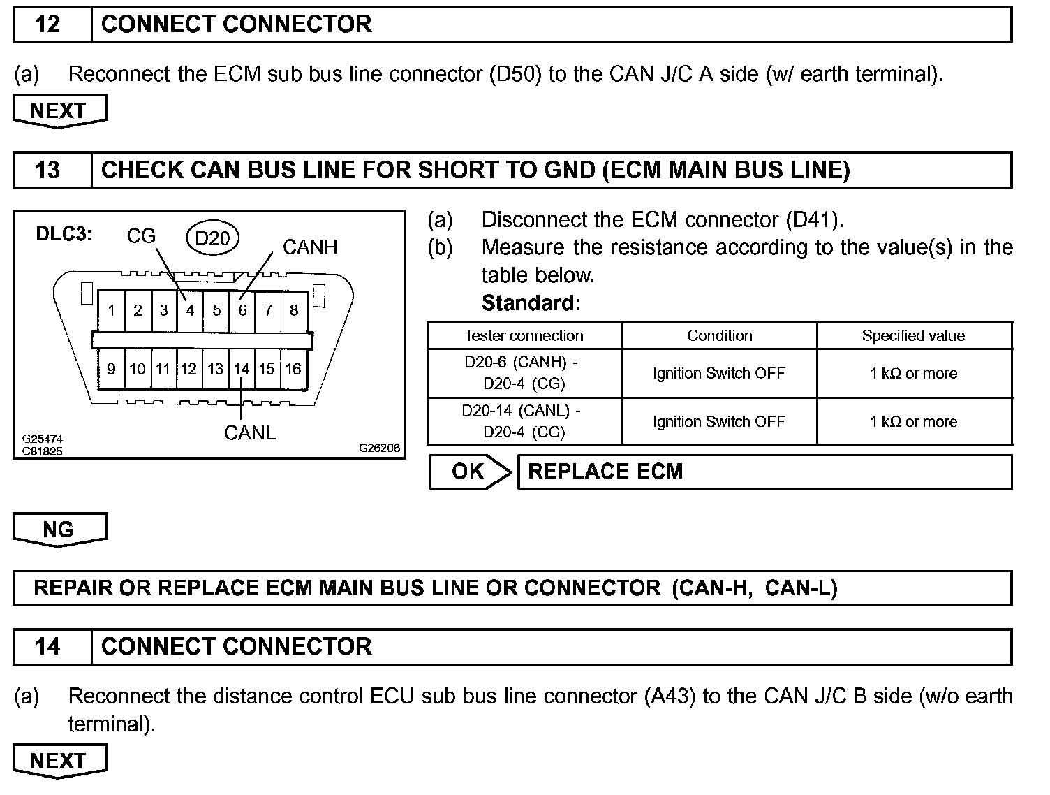 There may be a short circuit between the CAN bus line and GND when there is resistance between terminals 6 (CANH) and 4 (CG), or terminals 14 (CANL) and 4 (CG), of the DLC3.