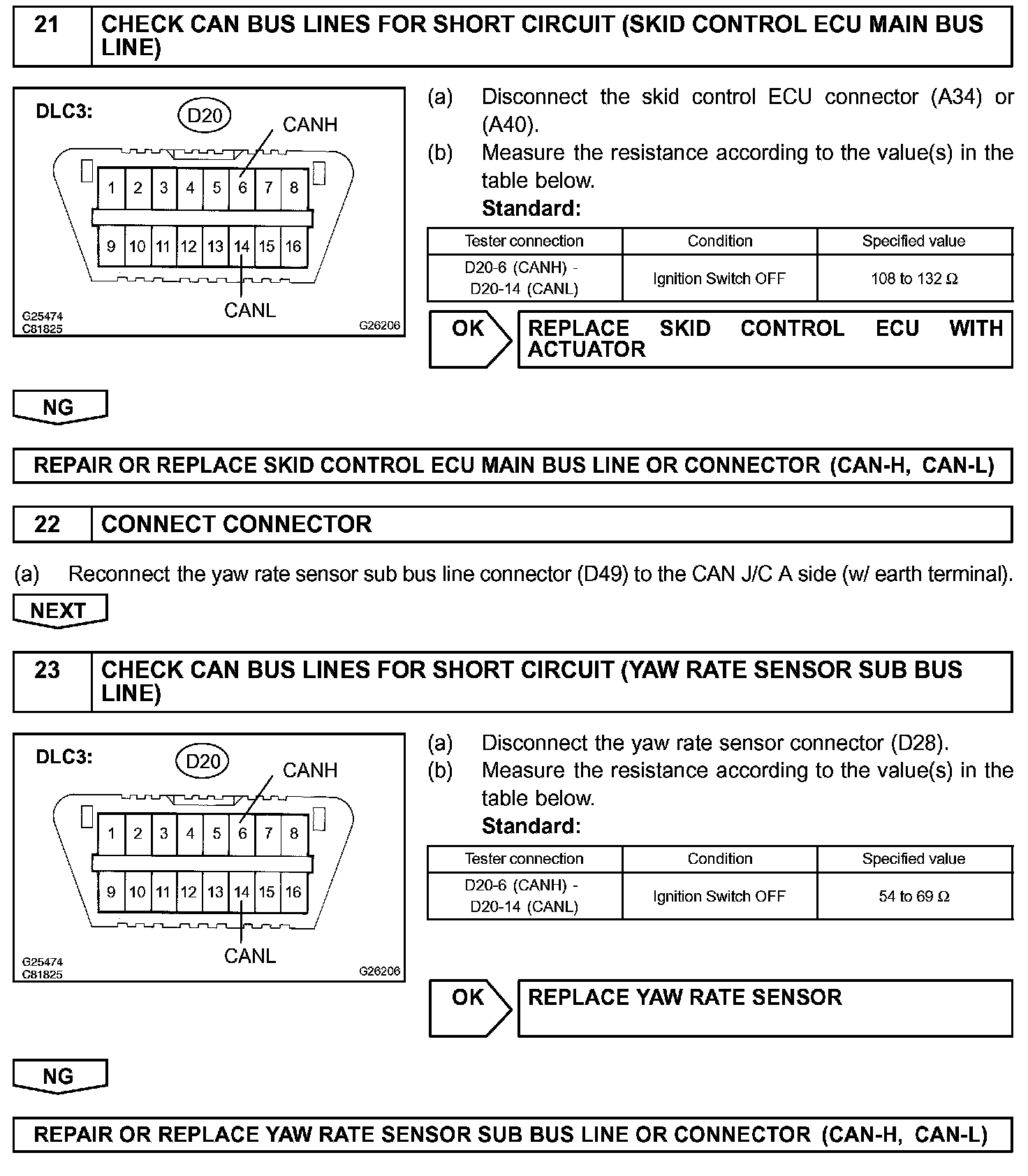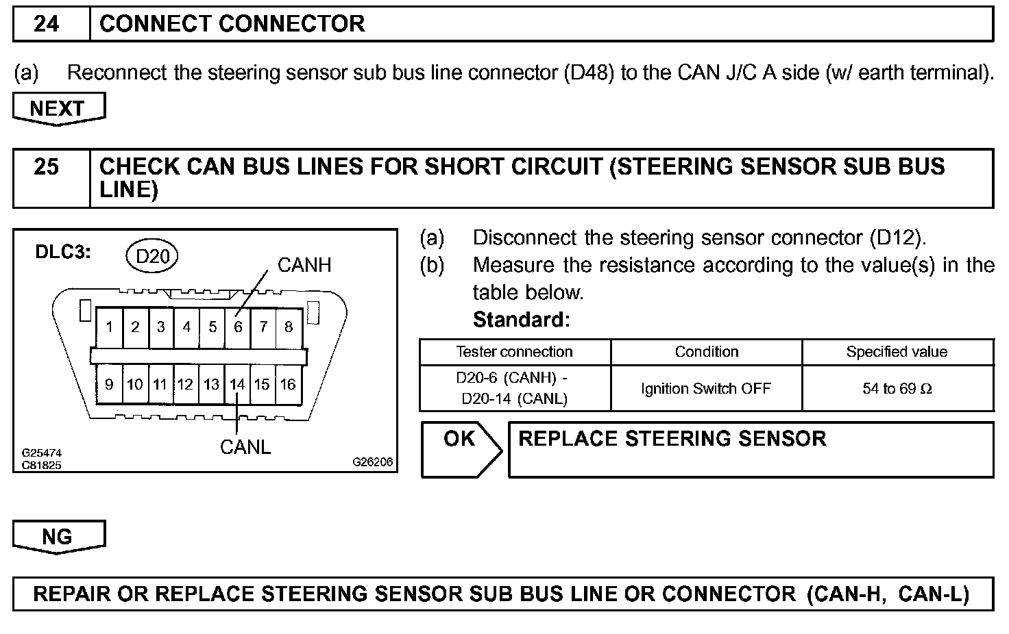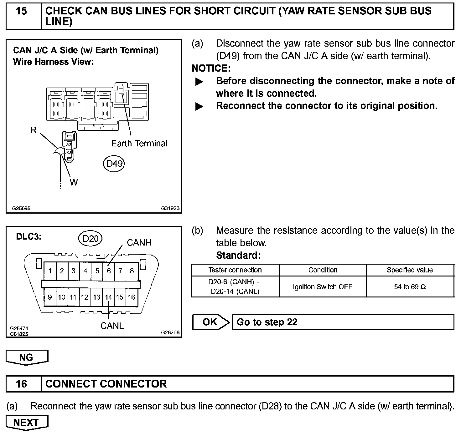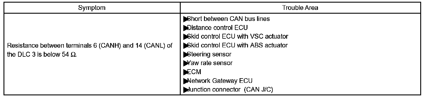 There may be a short circuit between the CAN bus lines when the resistance between terminals 6 (CANH) and 14 (CANL) of the DLC3 is below 54 Ohms.