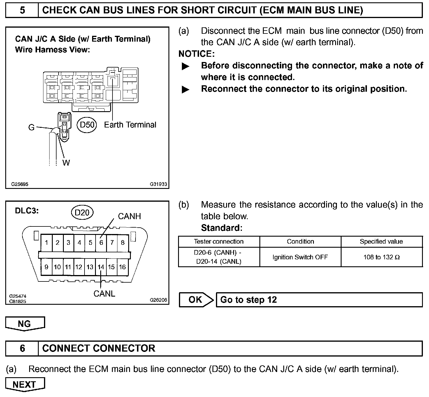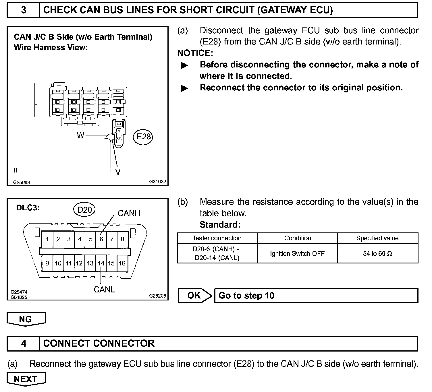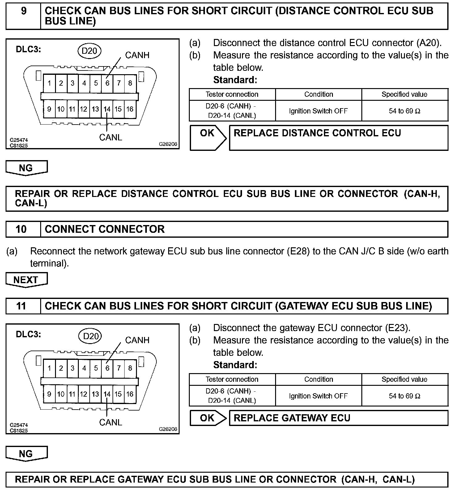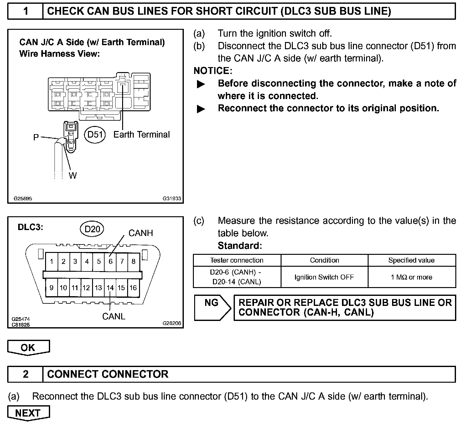 There may be a short circuit between the CAN bus lines when the resistance between terminals 6 (CANH) and 14 (CANL) of the DLC3 is below 54 Ohms.