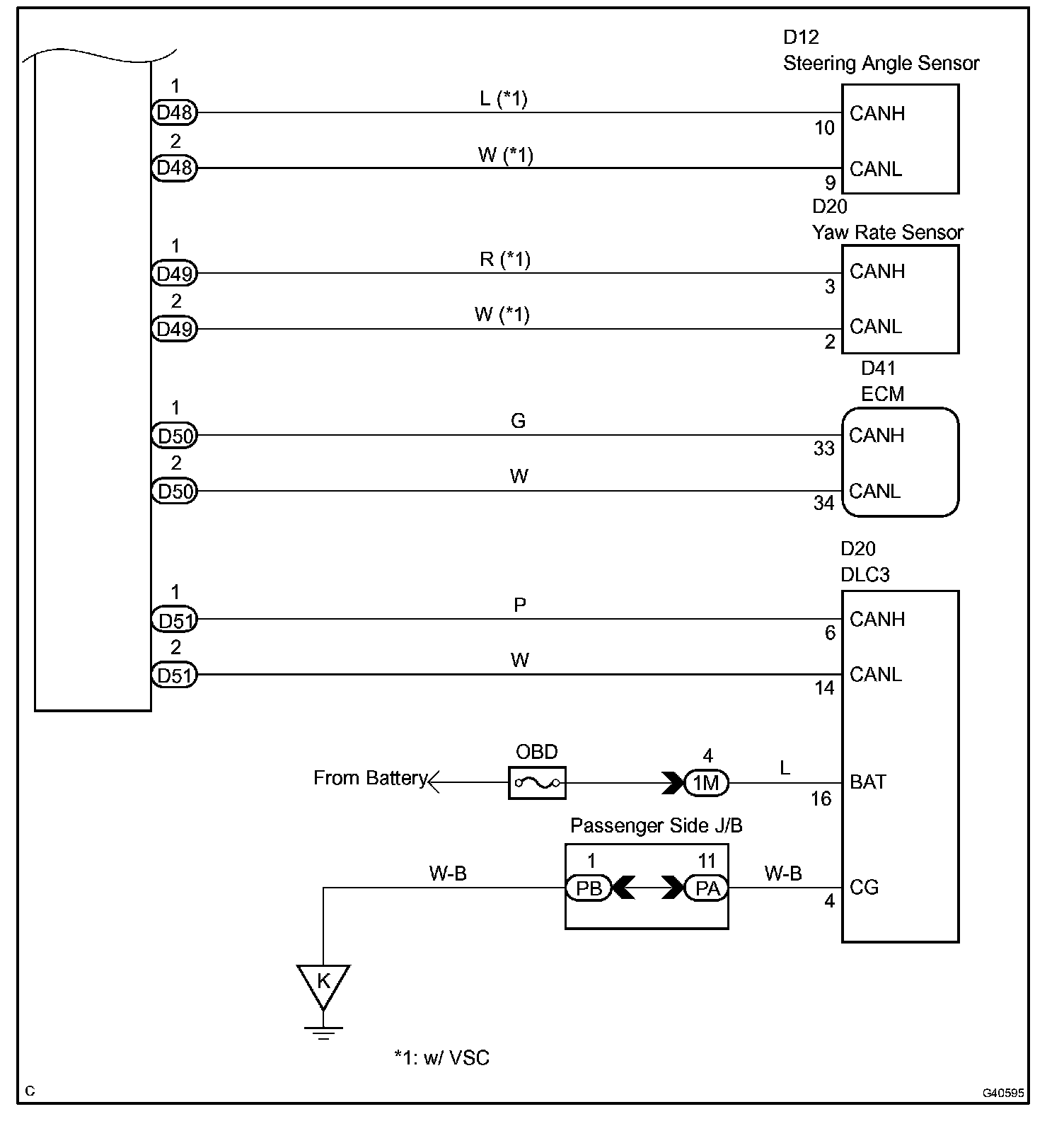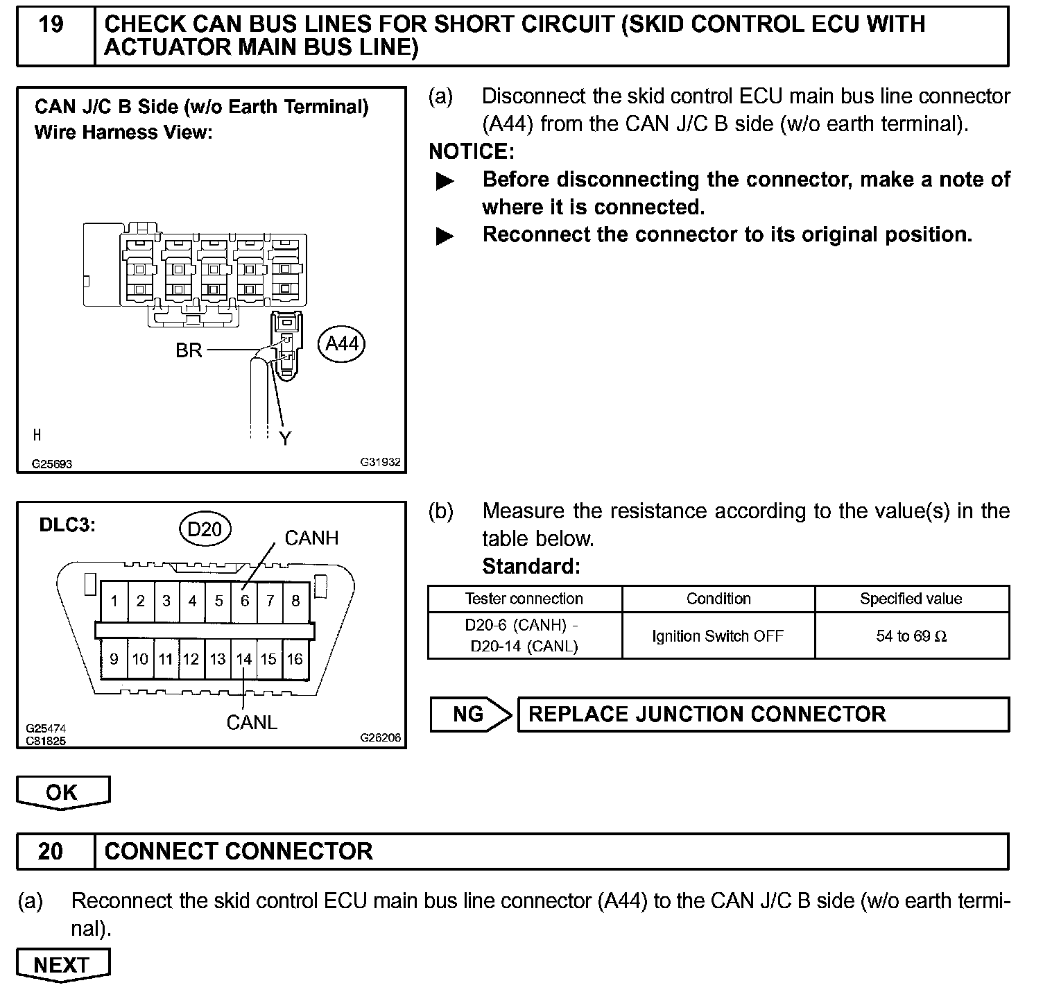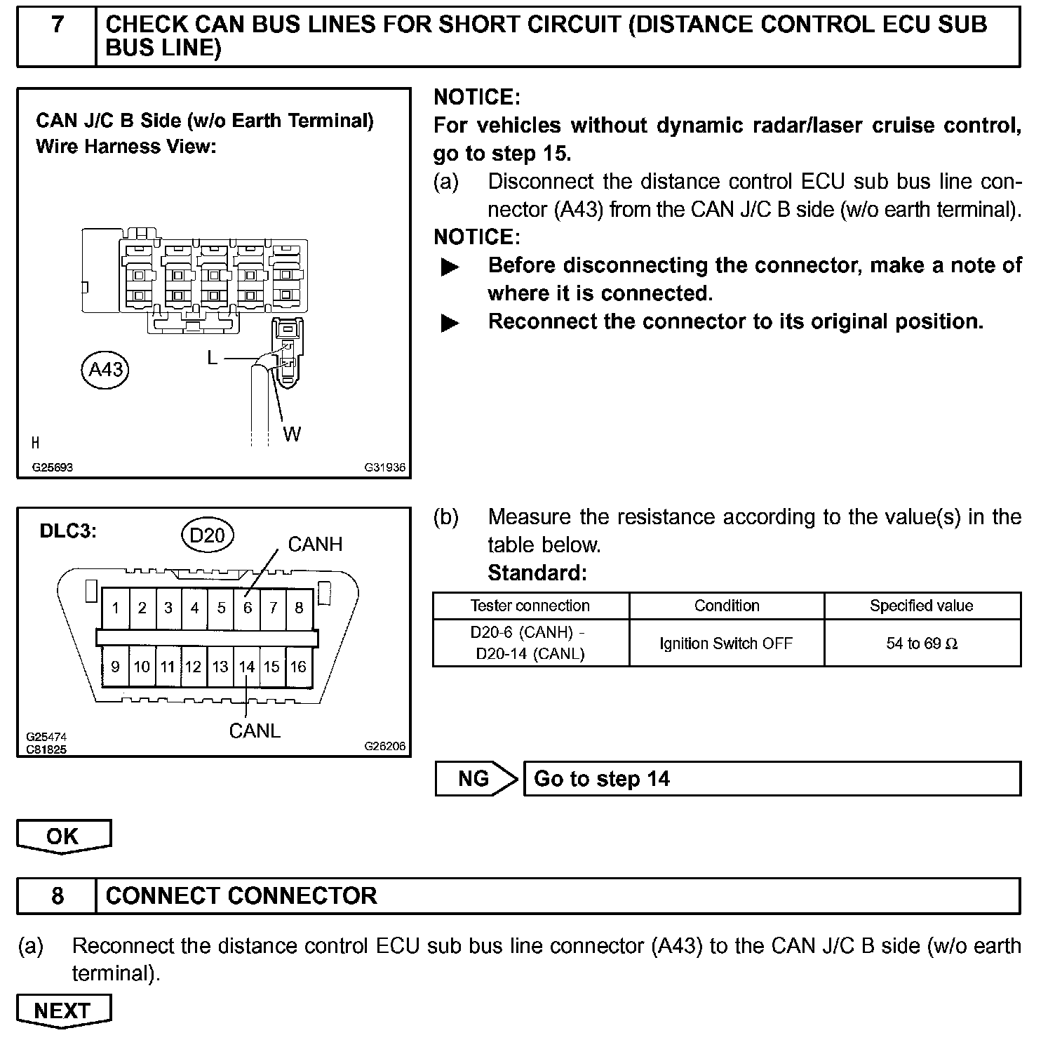 There may be a short circuit between the CAN bus lines when the resistance between terminals 6 (CANH) and 14 (CANL) of the DLC3 is below 54 Ohms.