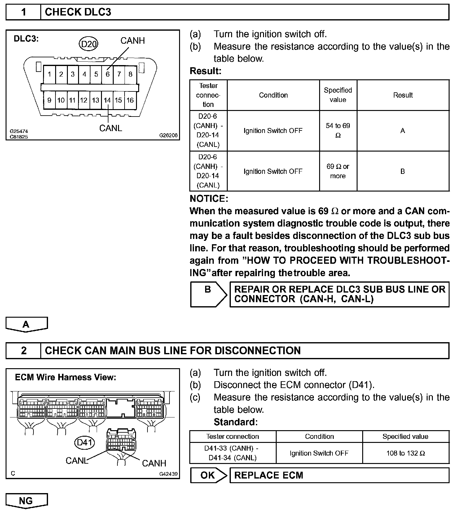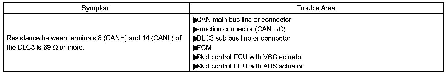 There may be an open circuit in the CAN main bus line and/or the DLC3 sub bus line when the resistance between terminals 6 (CANH) and 14 (CANL) of the DLC3 is 69 Ohms or more.