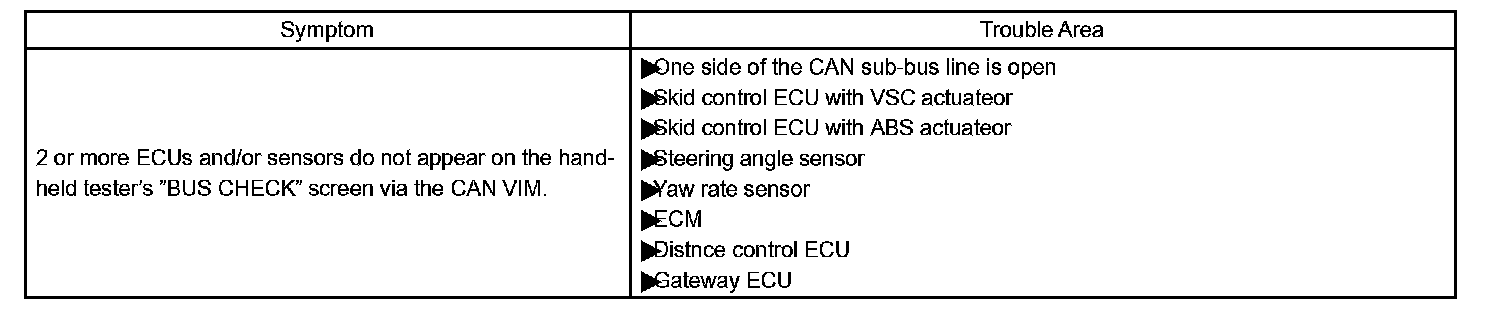 If 2 or more ECUs and/or sensors do not appear on the hand-held tester's "BUS CHECK" screen via the CAN VIM, one side of the CAN sub-bus line may be open. (One side of the CAN-H [sub-bus line]/CAN-L [sub-bus line] of the ECU and/or sensor is open.)