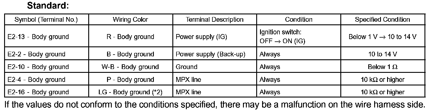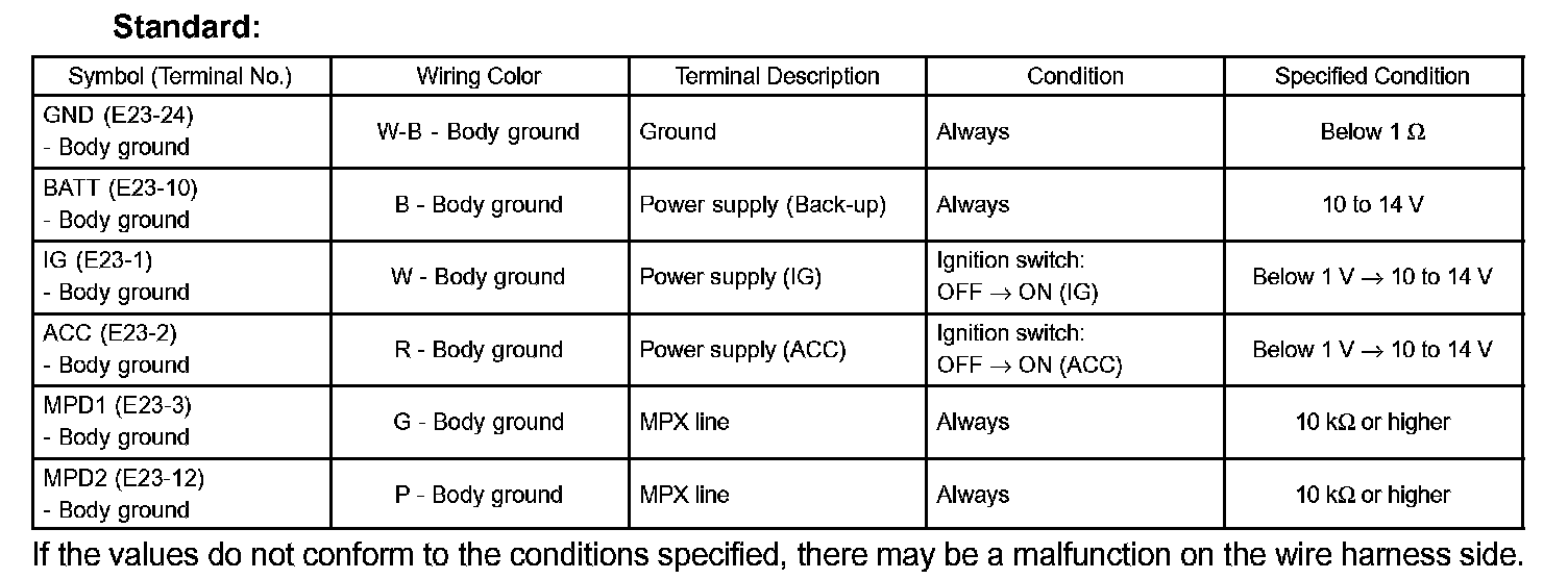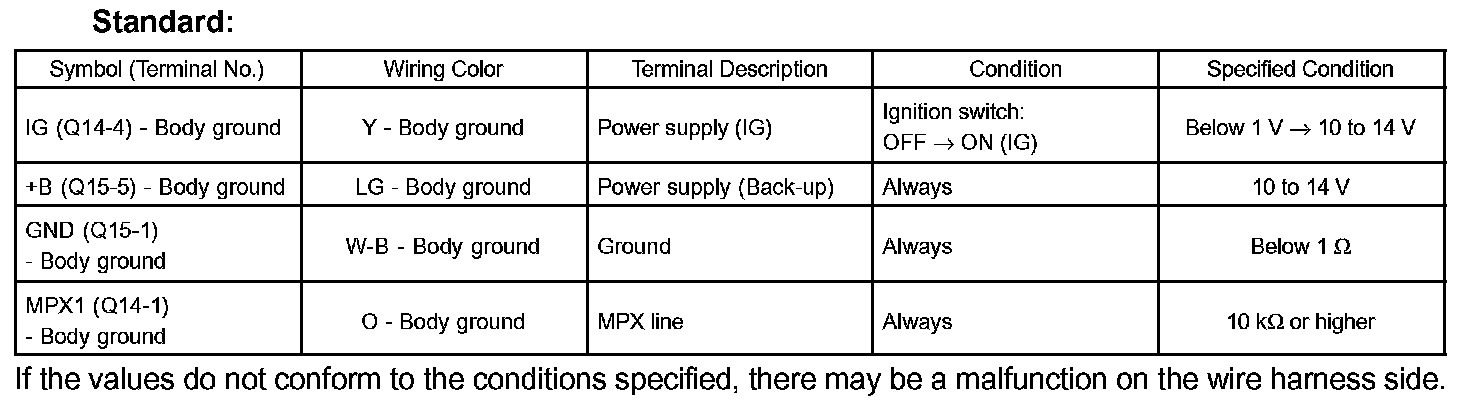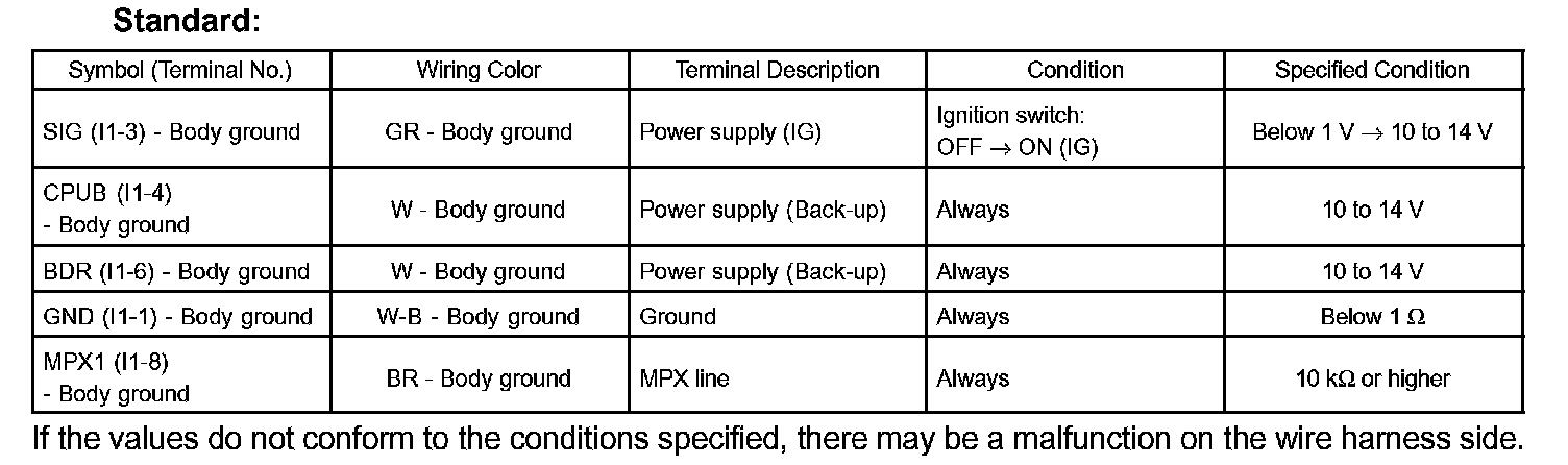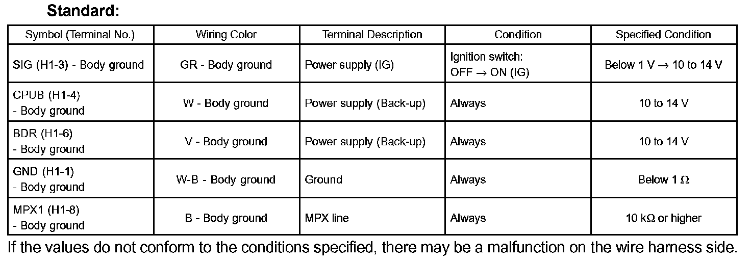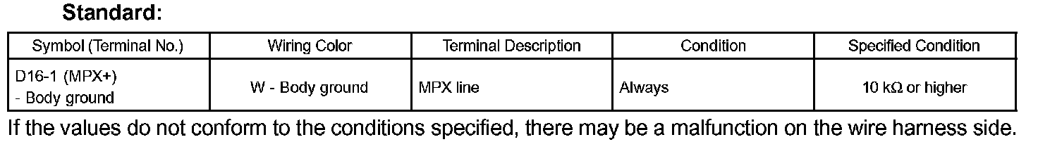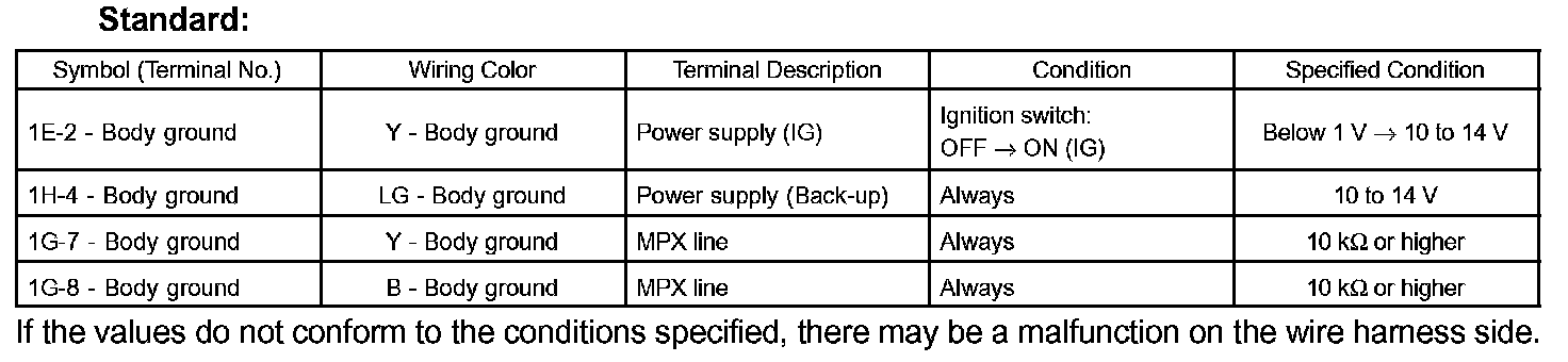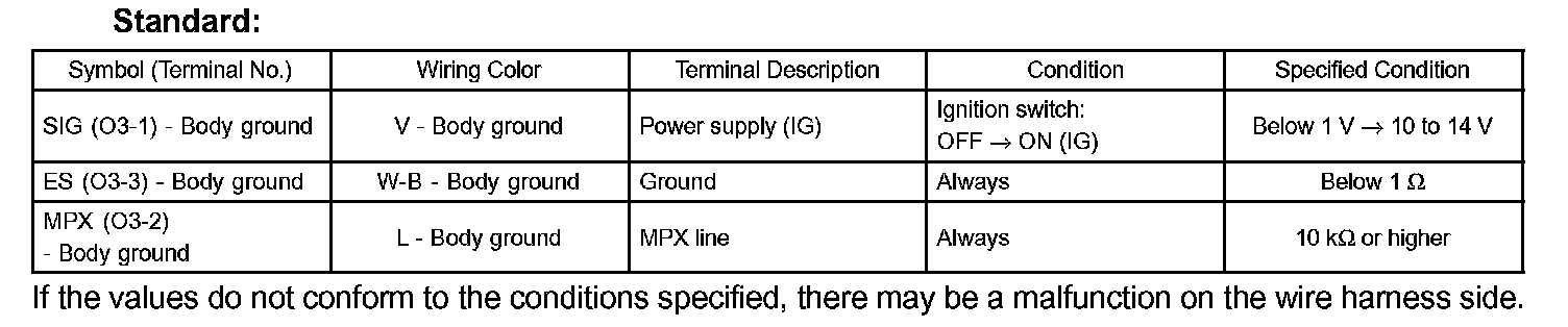 If the values do not conform to the conditions specified, there may be a malfunction on the wire harness side.