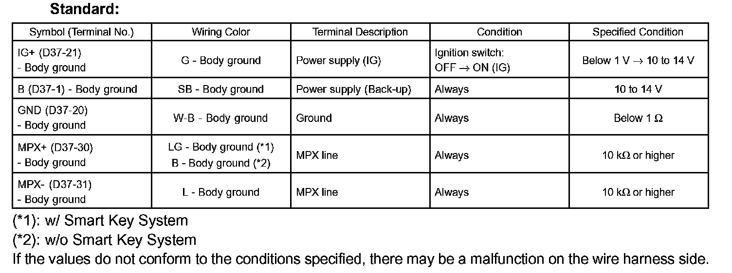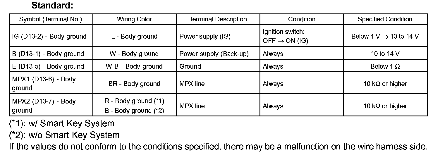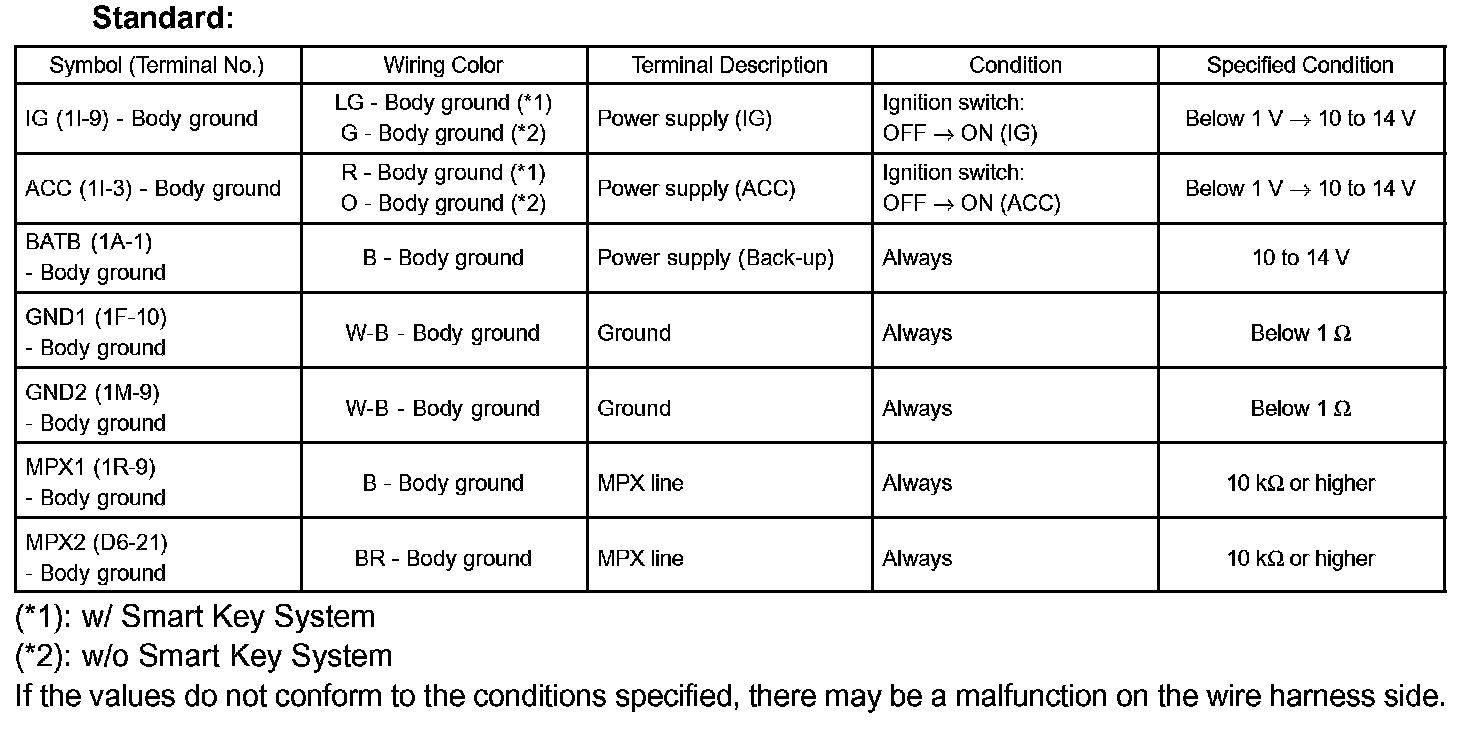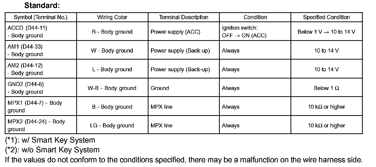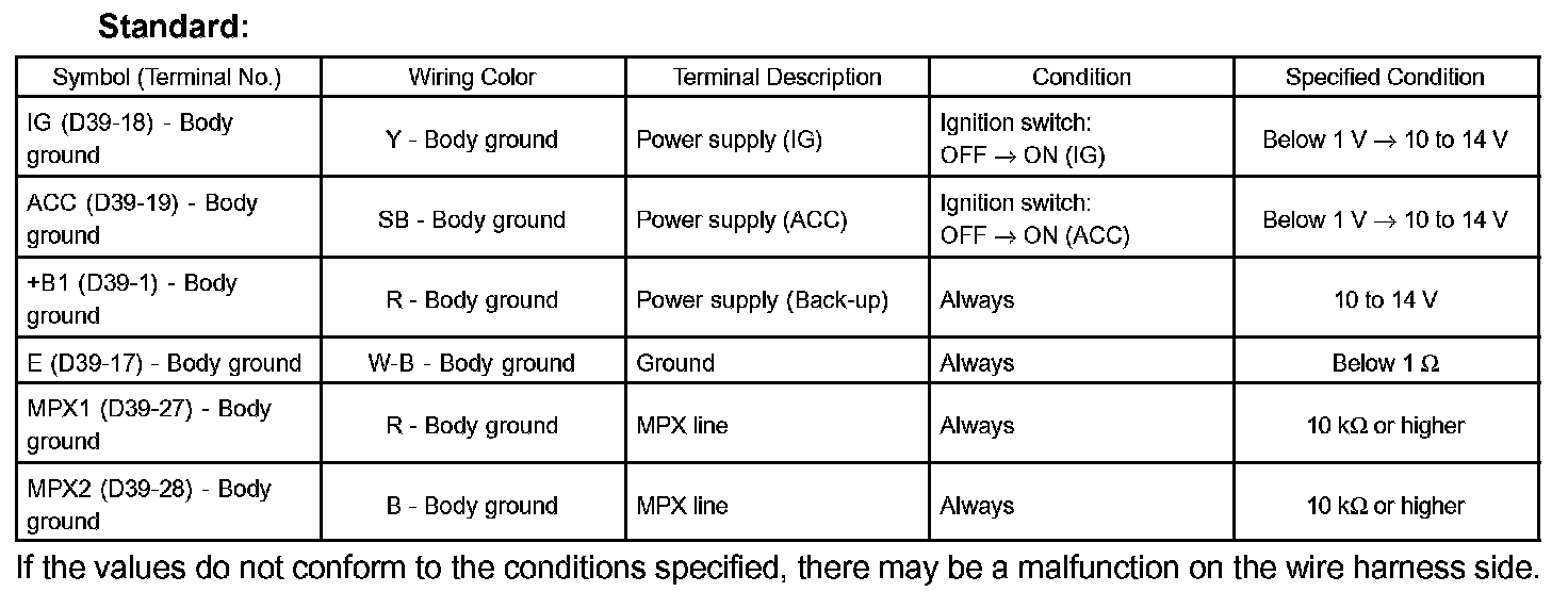 If the values do not conform to the conditions specified, there may be a malfunction on the wire harness side.