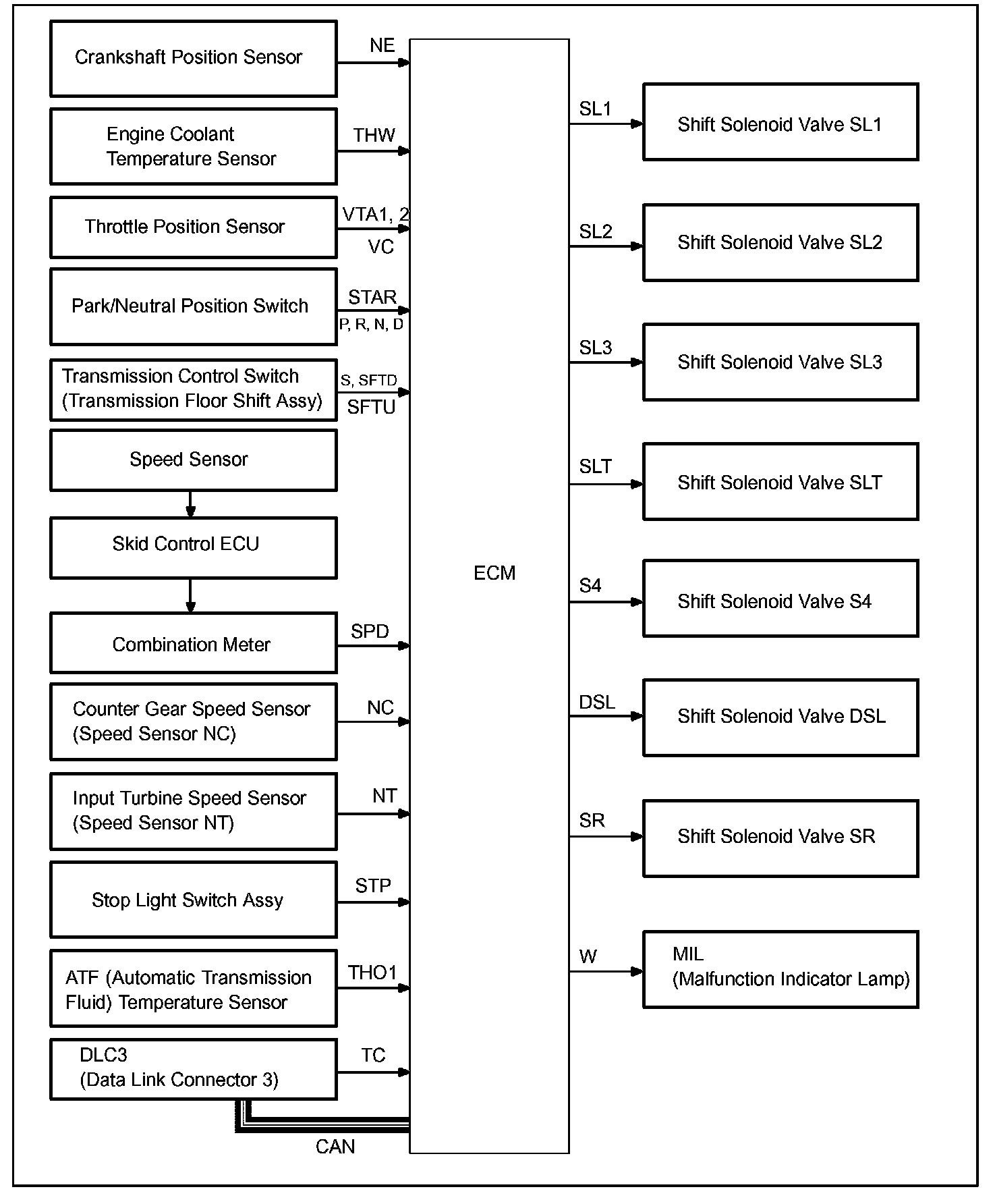 The configuration of the electronic control system in the U151E automatic transaxles is as shown in the chart.