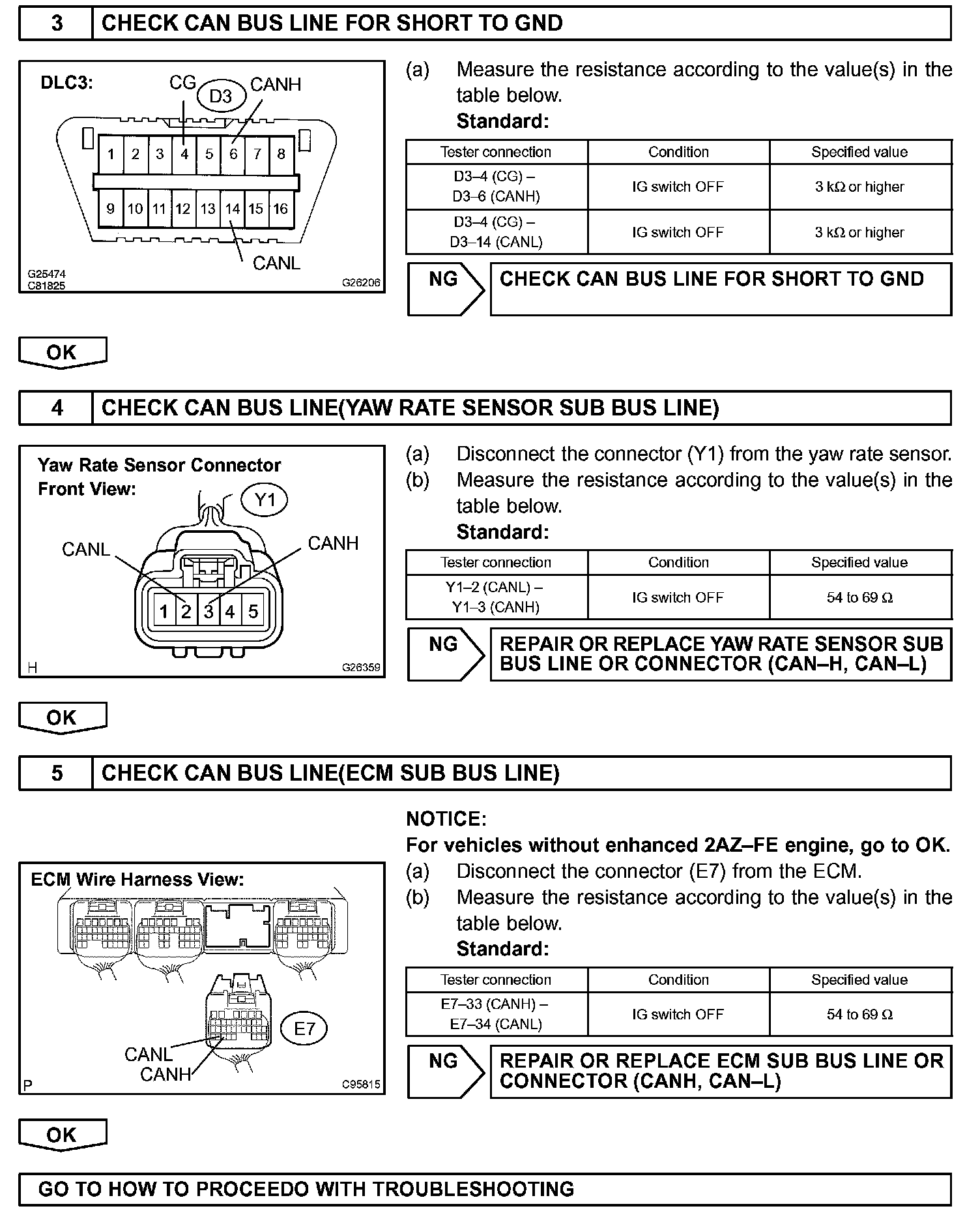 When any DTC for the CAN communication is output, first measure the resistance between the terminals of the DLC3 and the yaw rate sensor connector to specify the trouble area.