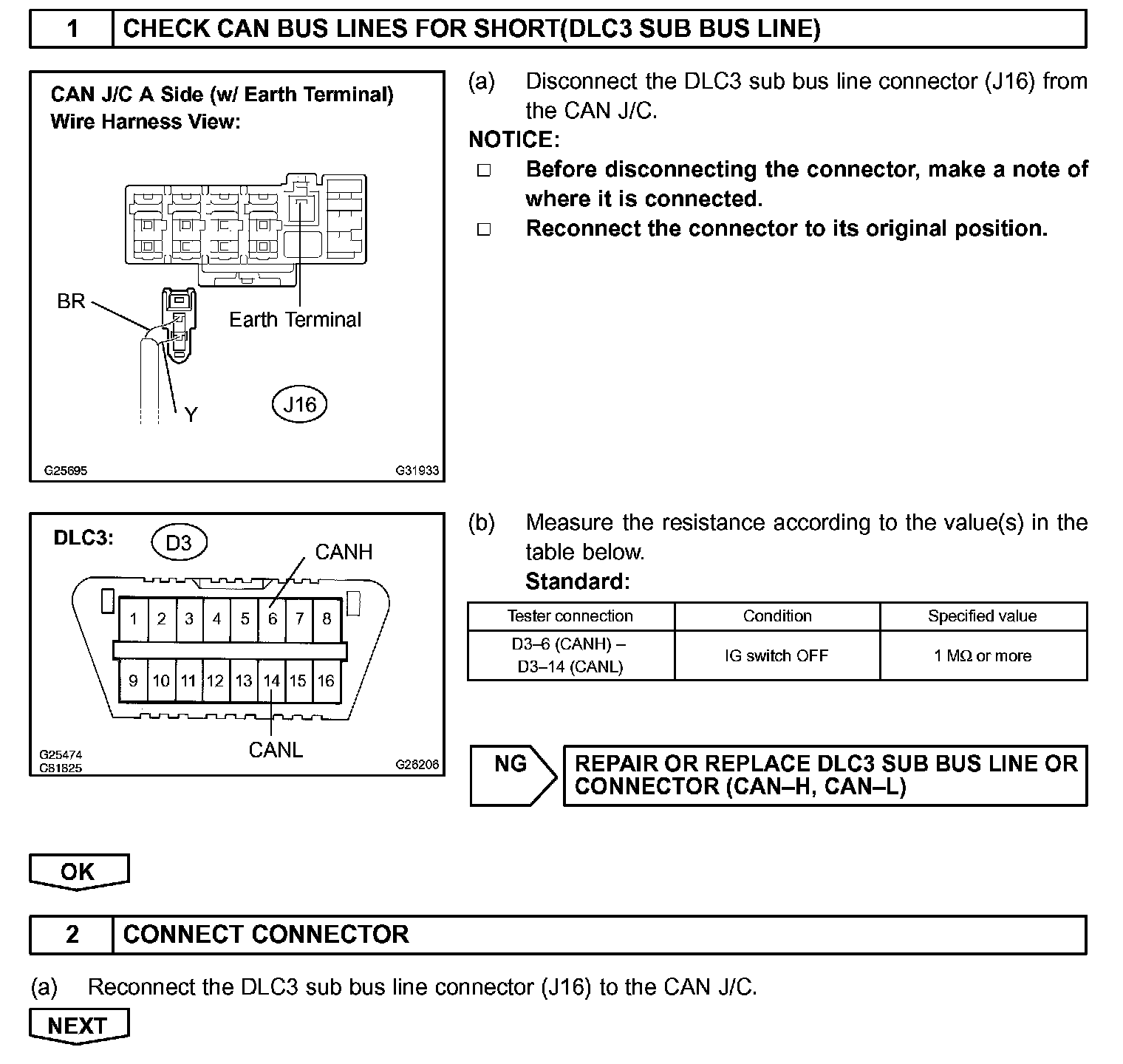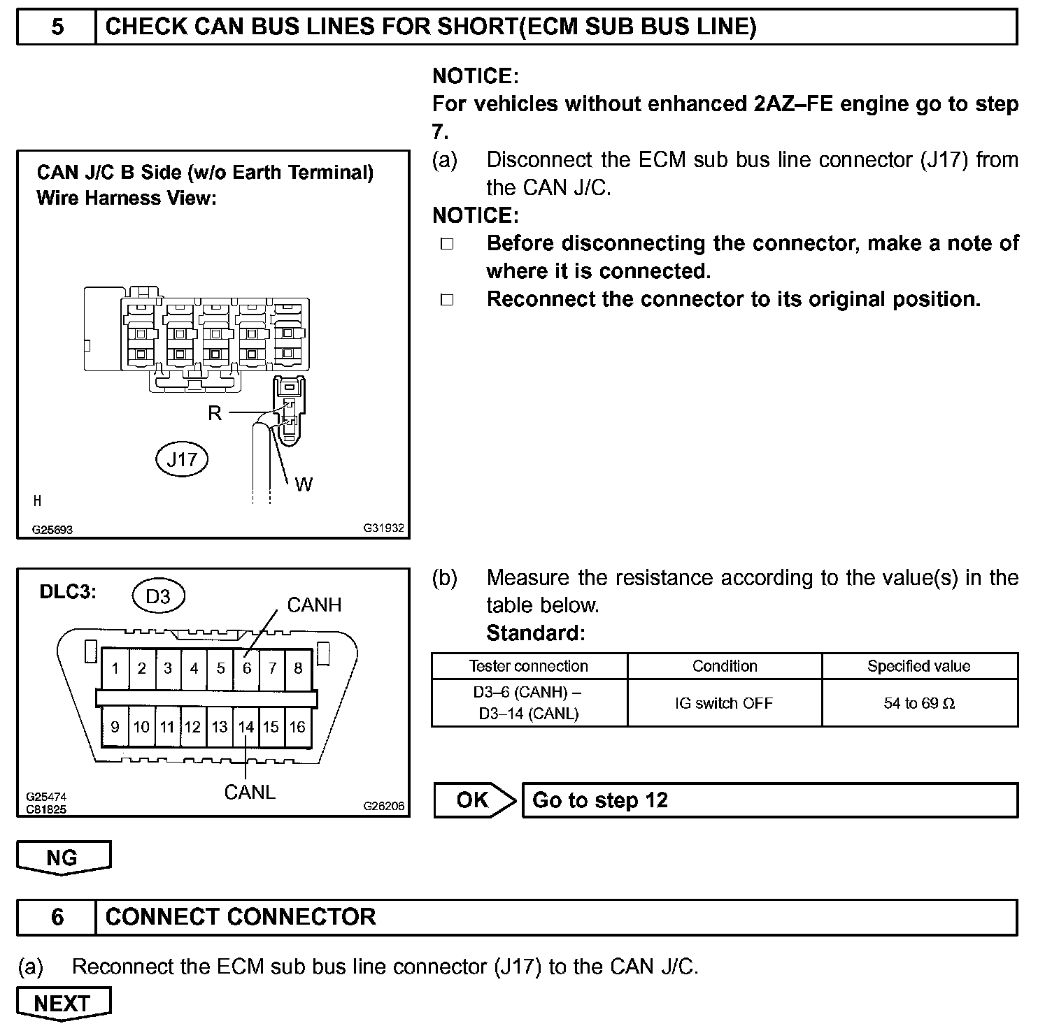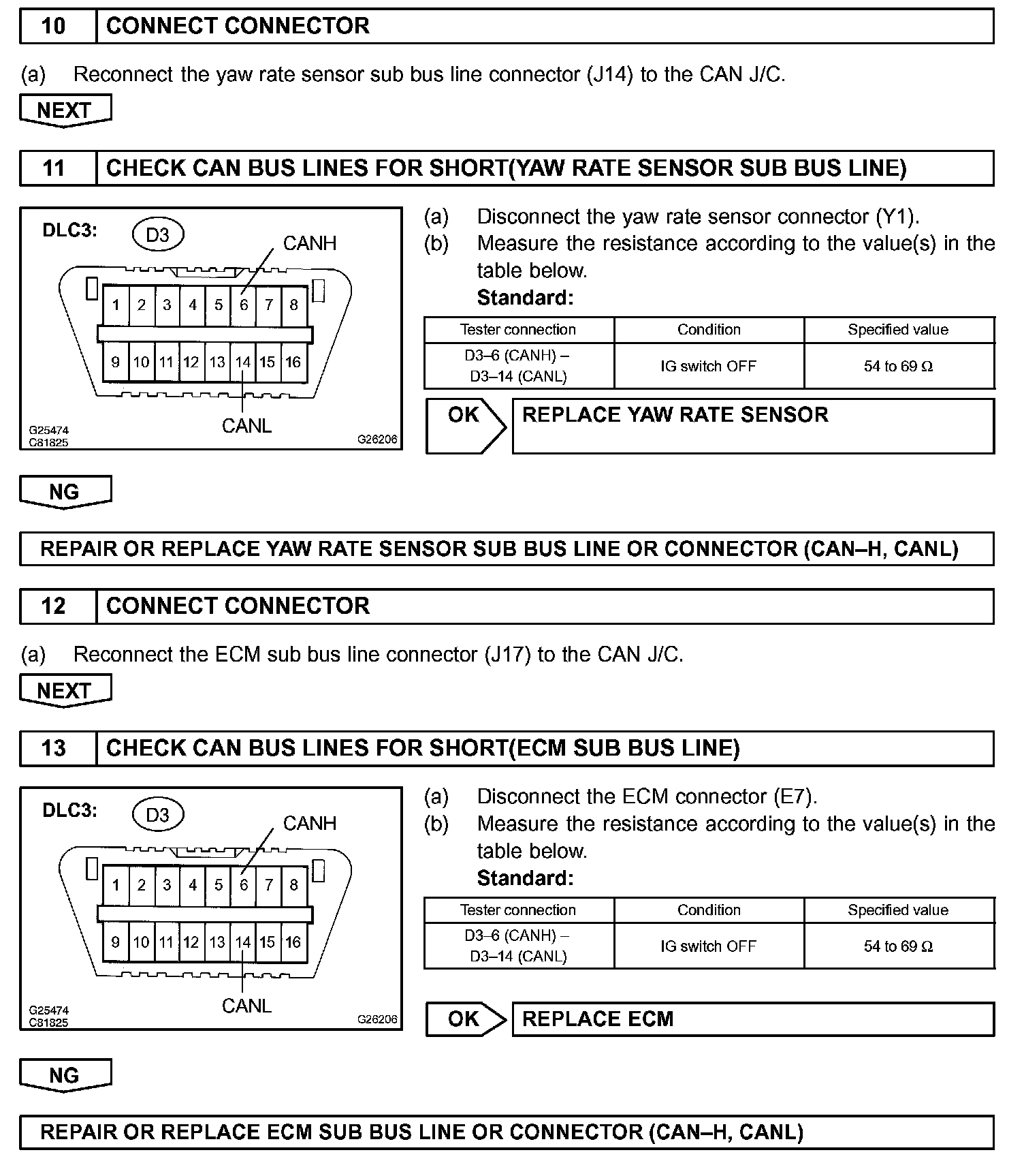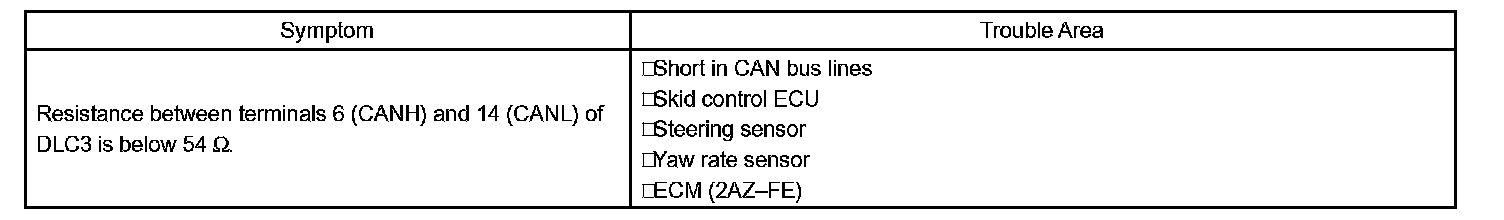 The CAN bus lines are considered to be shorted when the resistance between terminals 6 (CANH) and 14 CANL) of the DLC3 is below 54 Ohm.