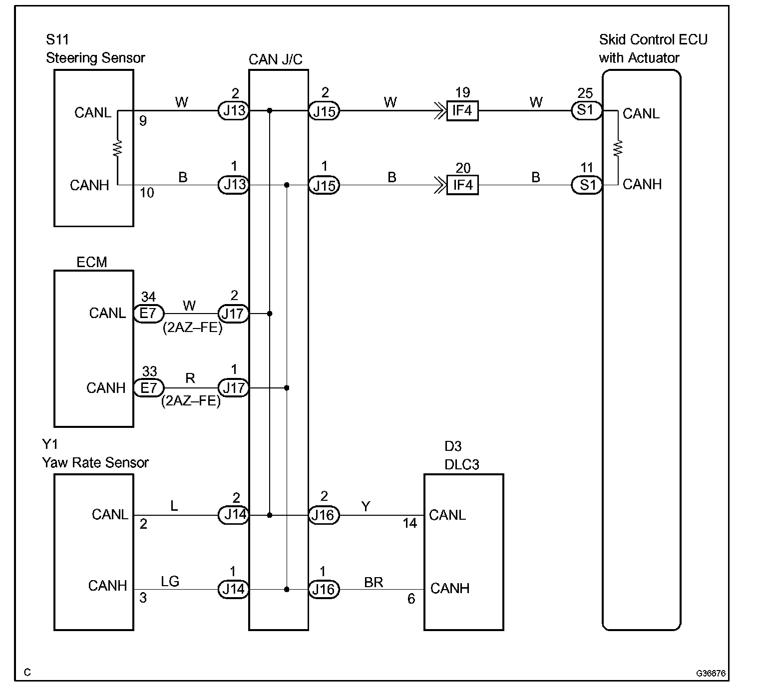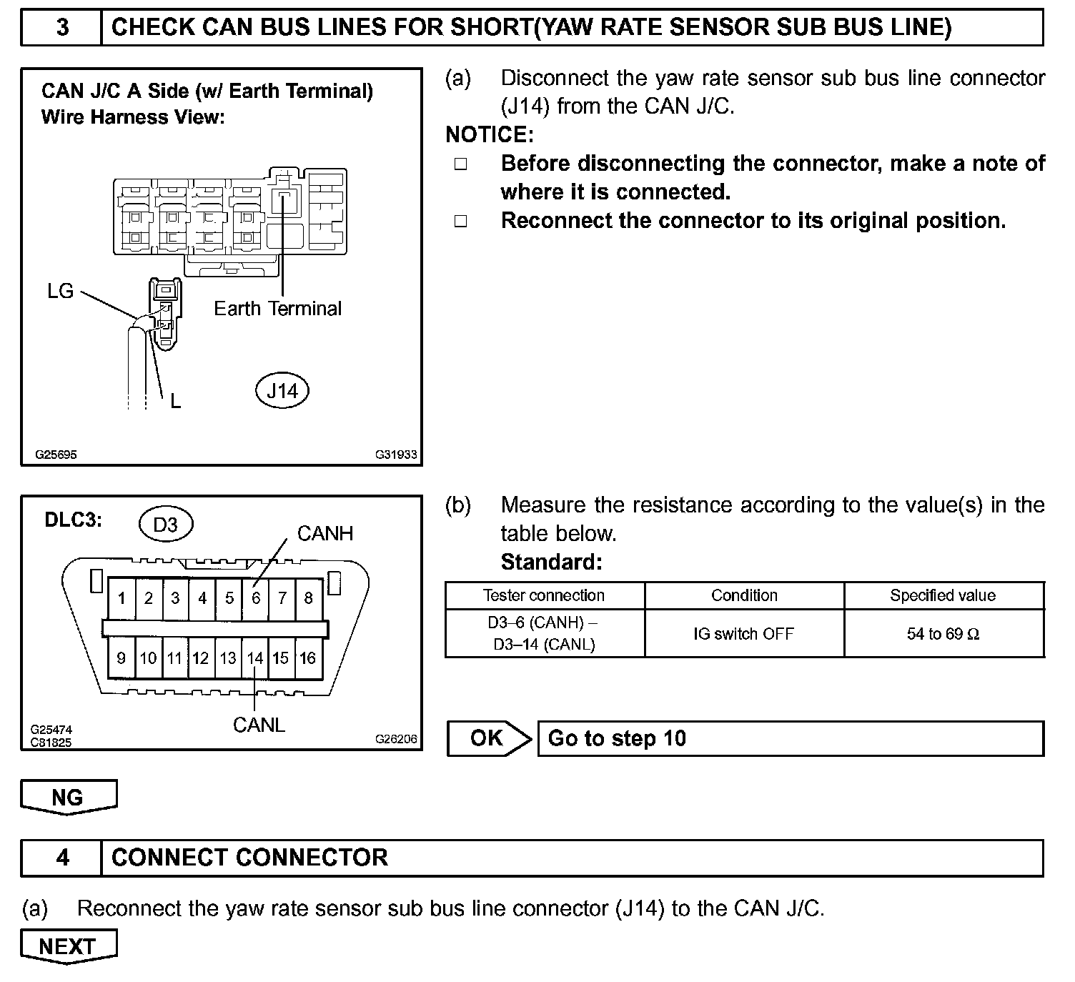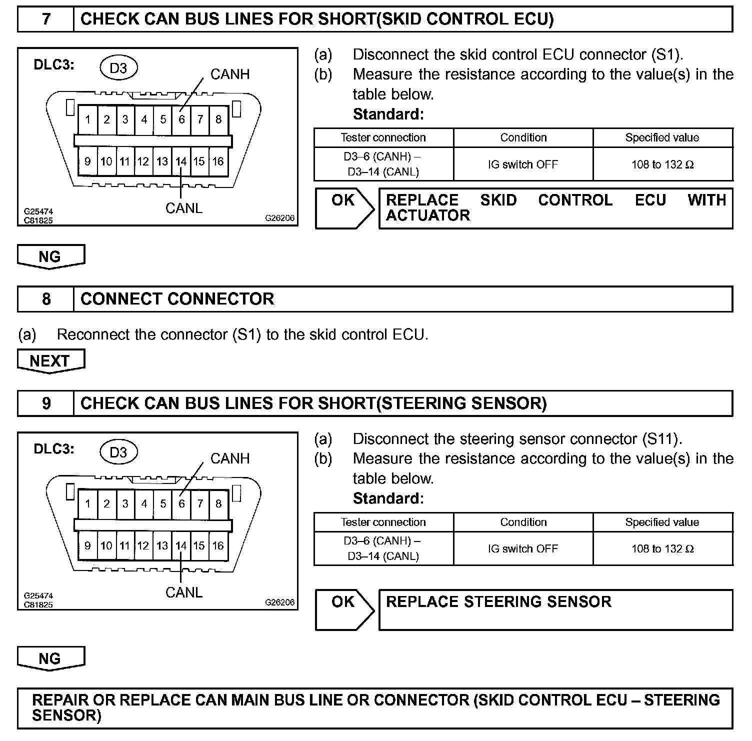The CAN bus lines are considered to be shorted when the resistance between terminals 6 (CANH) and 14 CANL) of the DLC3 is below 54 Ohm.